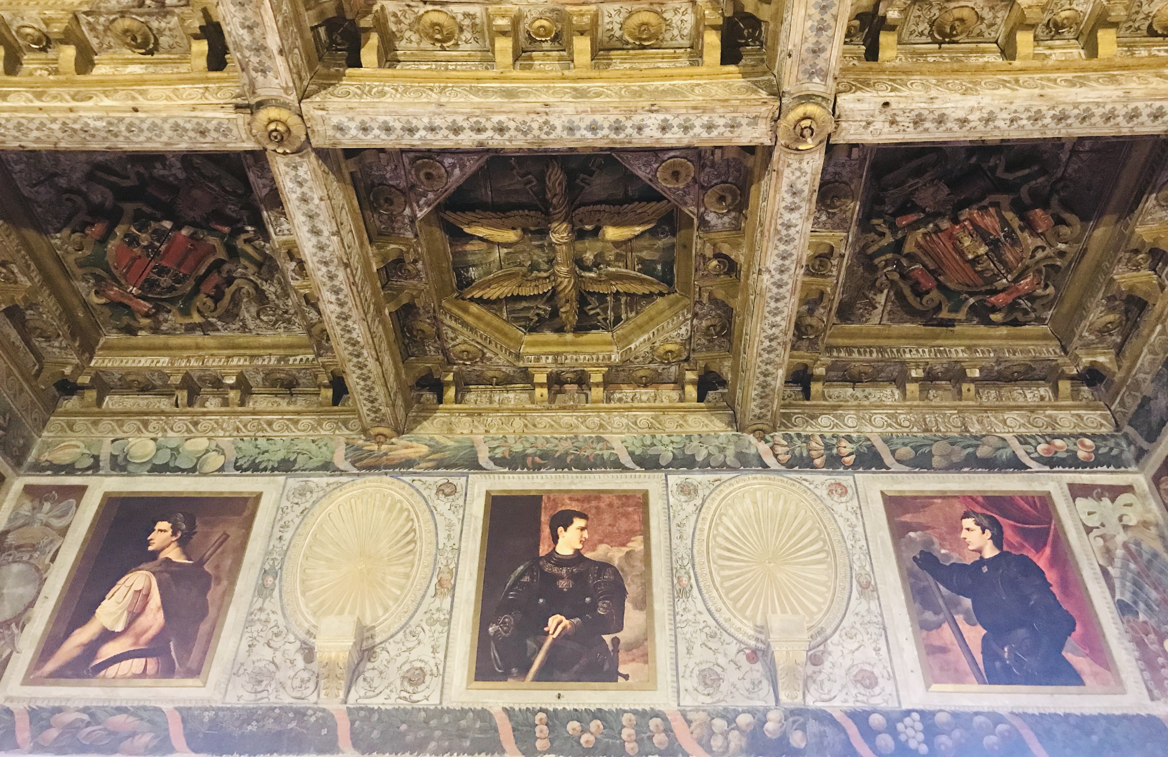 En la planta baja también me moló la sala d’Oro, dedicada a Fernando Álvarez de Toledo, un colega de Vespasiano. Y ahora os preguntaréis: ¿Por qué aparece el nombre de un español? Muy simple: nuestro querido duque pasó una larga temporada en España y era íntimo de Felipe II y compañía. Pero bueno, a lo que íbamos: la sala es guay porque alberga una imponente chimenea de mármol rosa de Verona decorada con dos leones y un techo de madera, todo él recubierto de una fina lámina de oro puro.