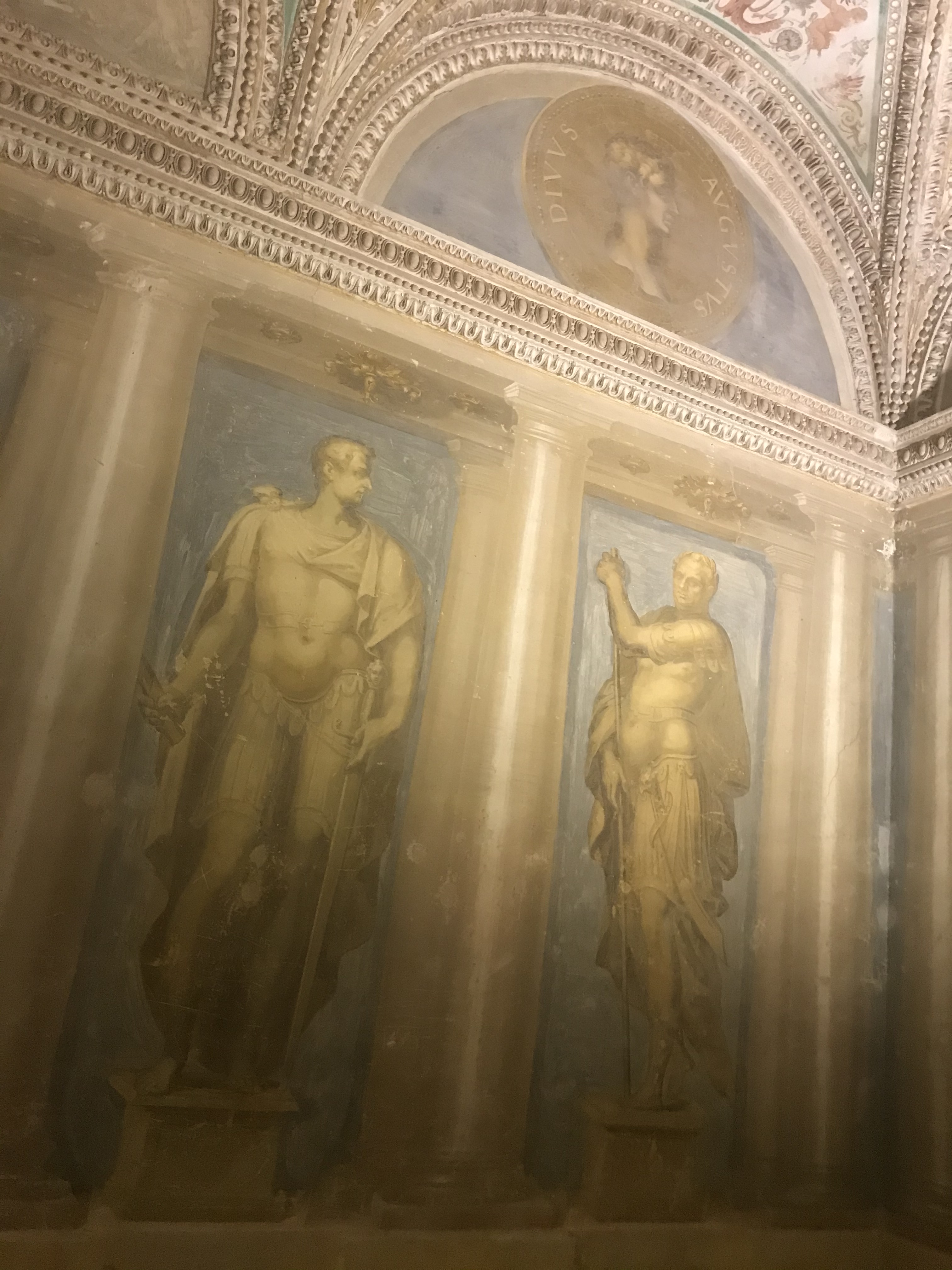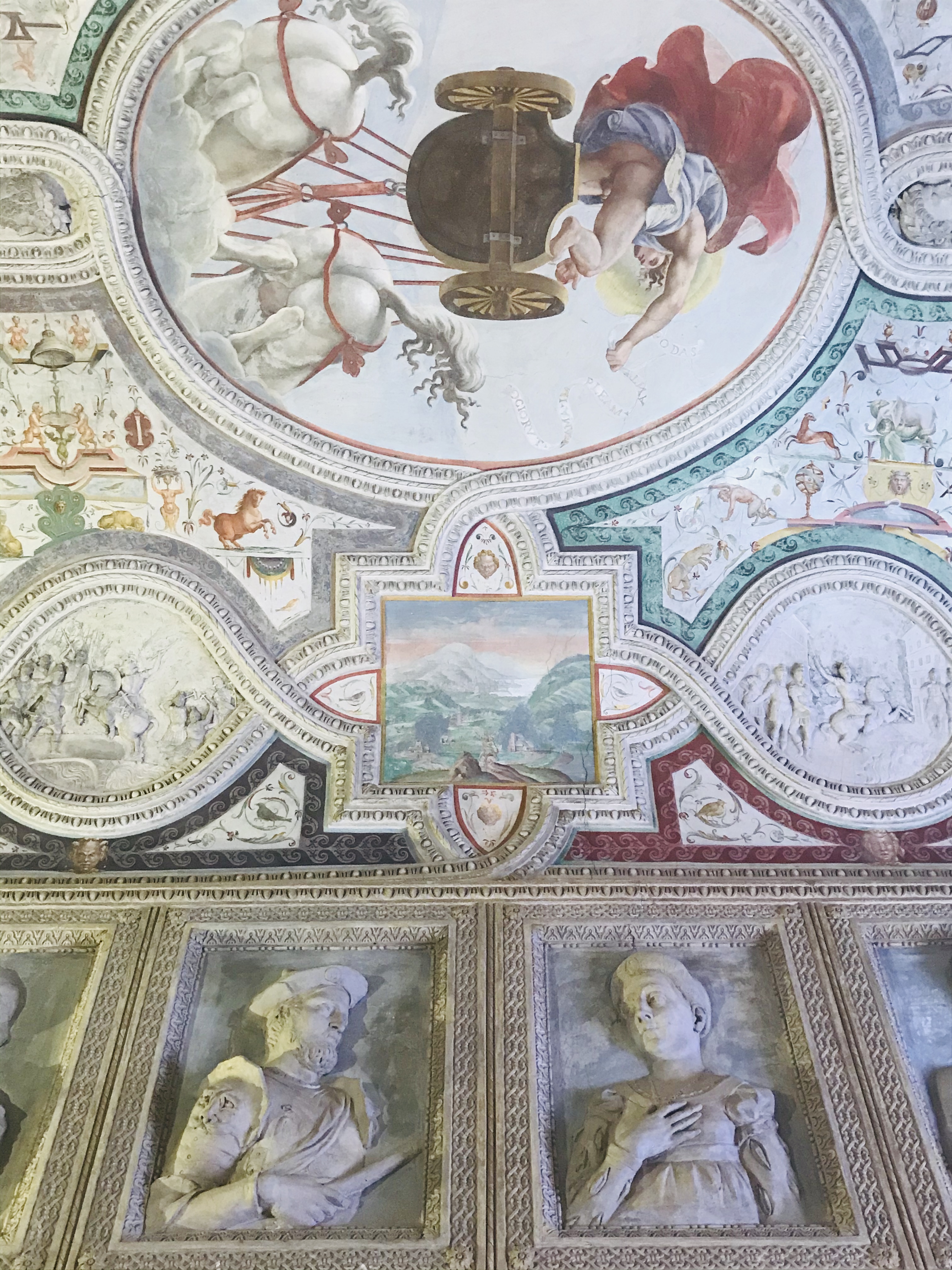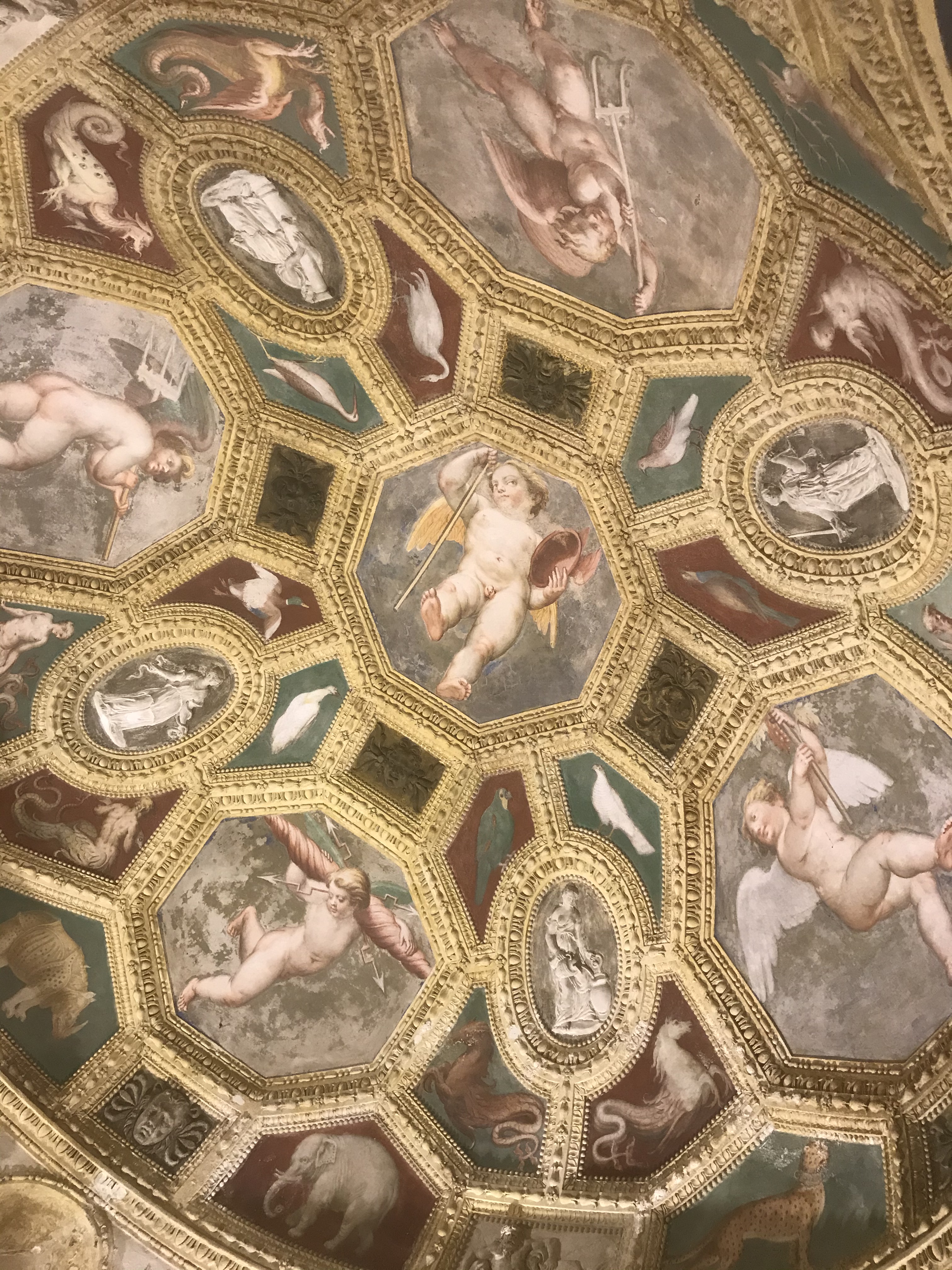 De todas maneras, uno de los ambientes más importantes es la sala di Diana ed Endimione, llamada así por el fresco de Bernardino Campi que reinaba en ella. He escrito «reinaba» y no «reina» porque, por desgracia, está muy deteriorado. Lo que sí se ve bien es el resto de la decoración, que es grutesca y pretende celebrar los hitos de Vespasiano.