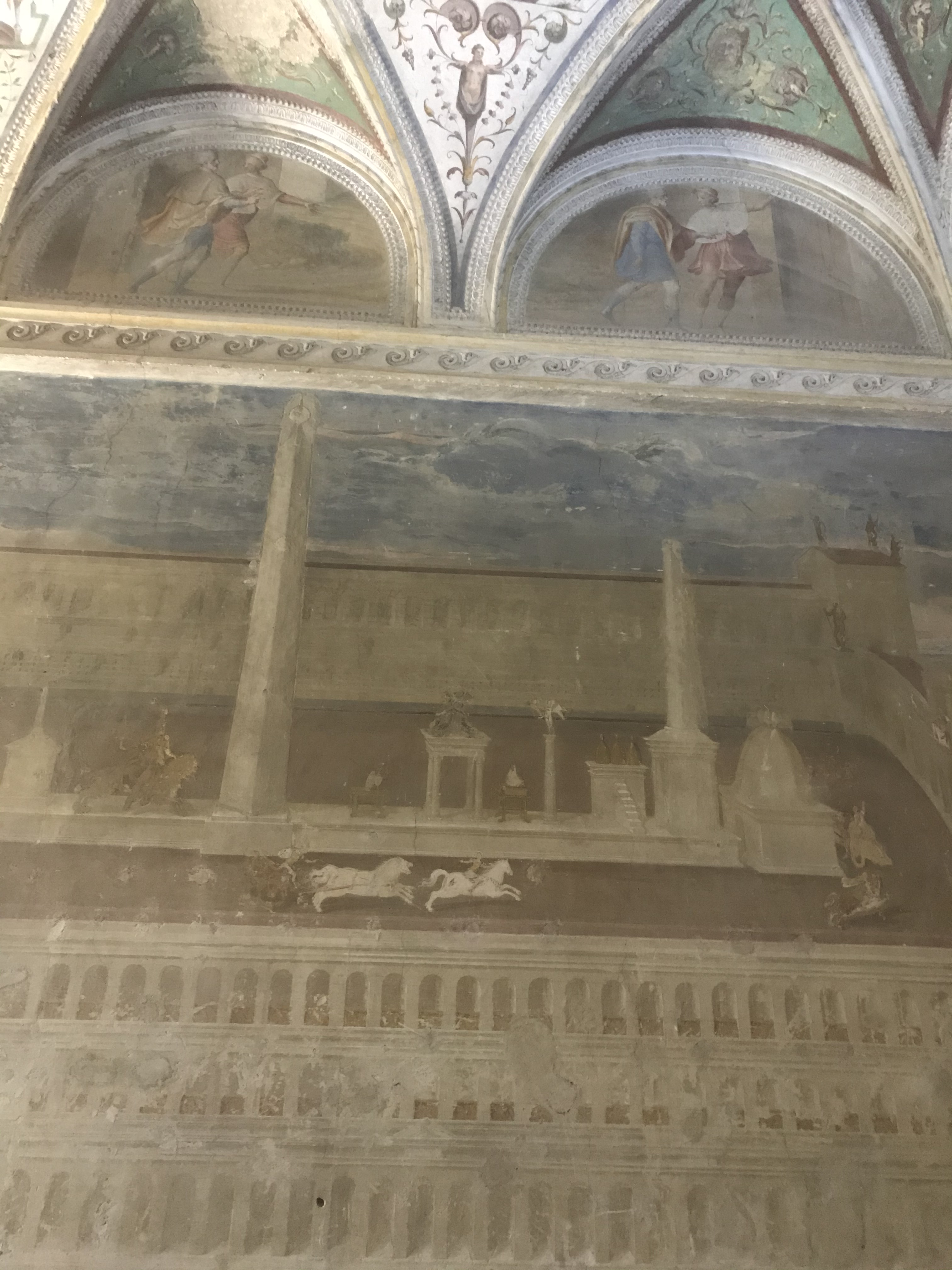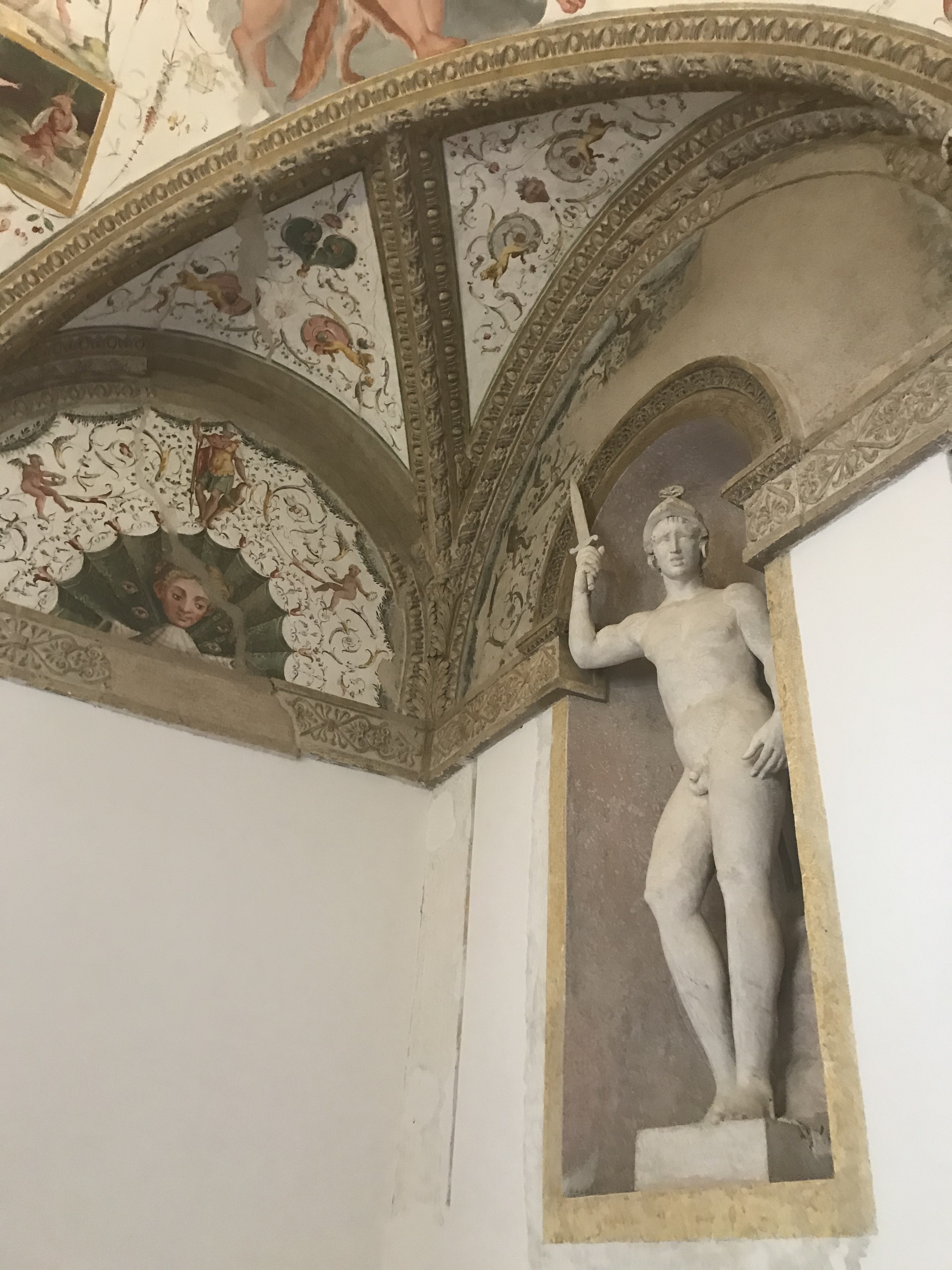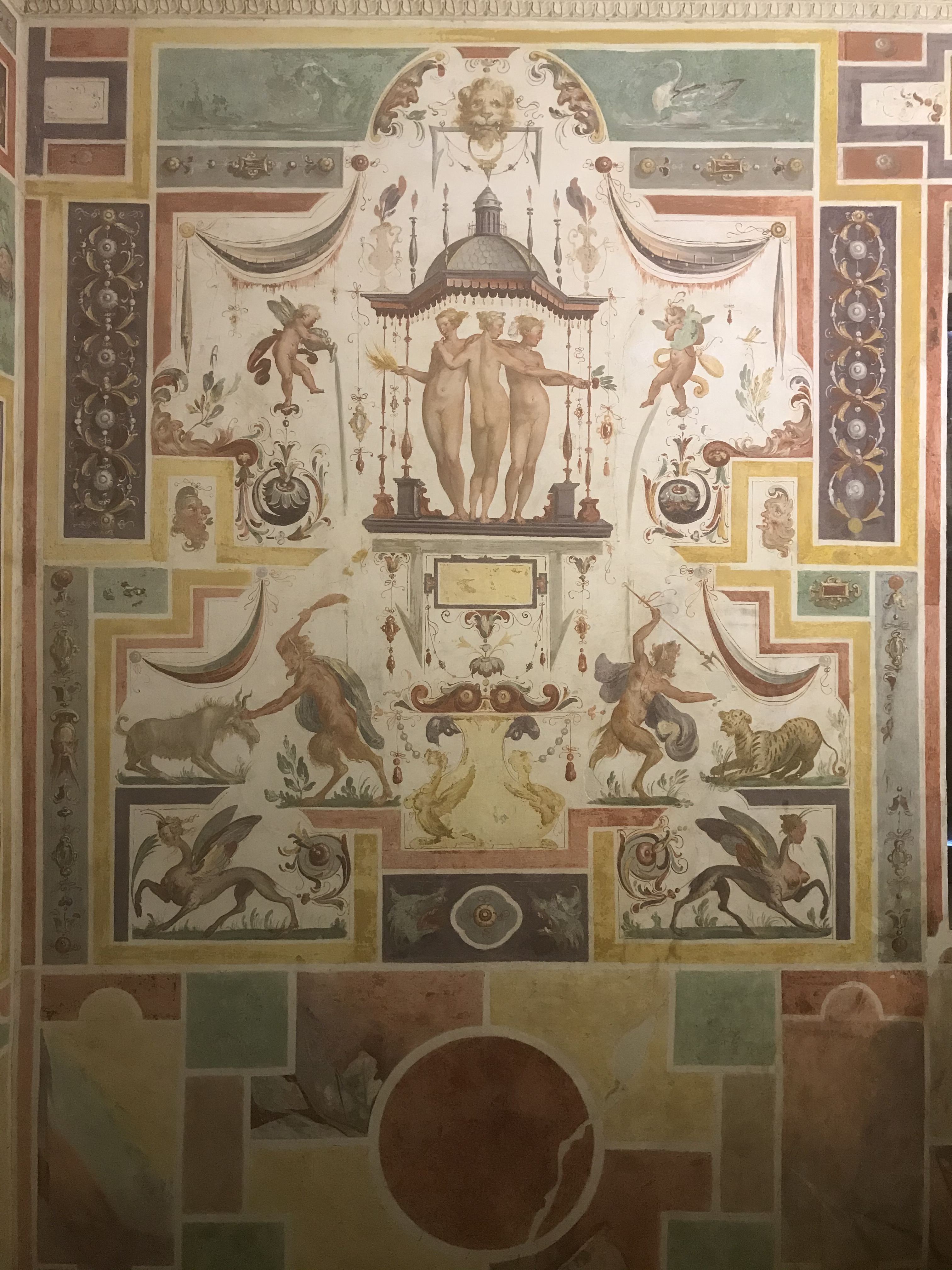 De todas maneras, uno de los ambientes más importantes es la sala di Diana ed Endimione, llamada así por el fresco de Bernardino Campi que reinaba en ella. He escrito «reinaba» y no «reina» porque, por desgracia, está muy deteriorado. Lo que sí se ve bien es el resto de la decoración, que es grutesca y pretende celebrar los hitos de Vespasiano.