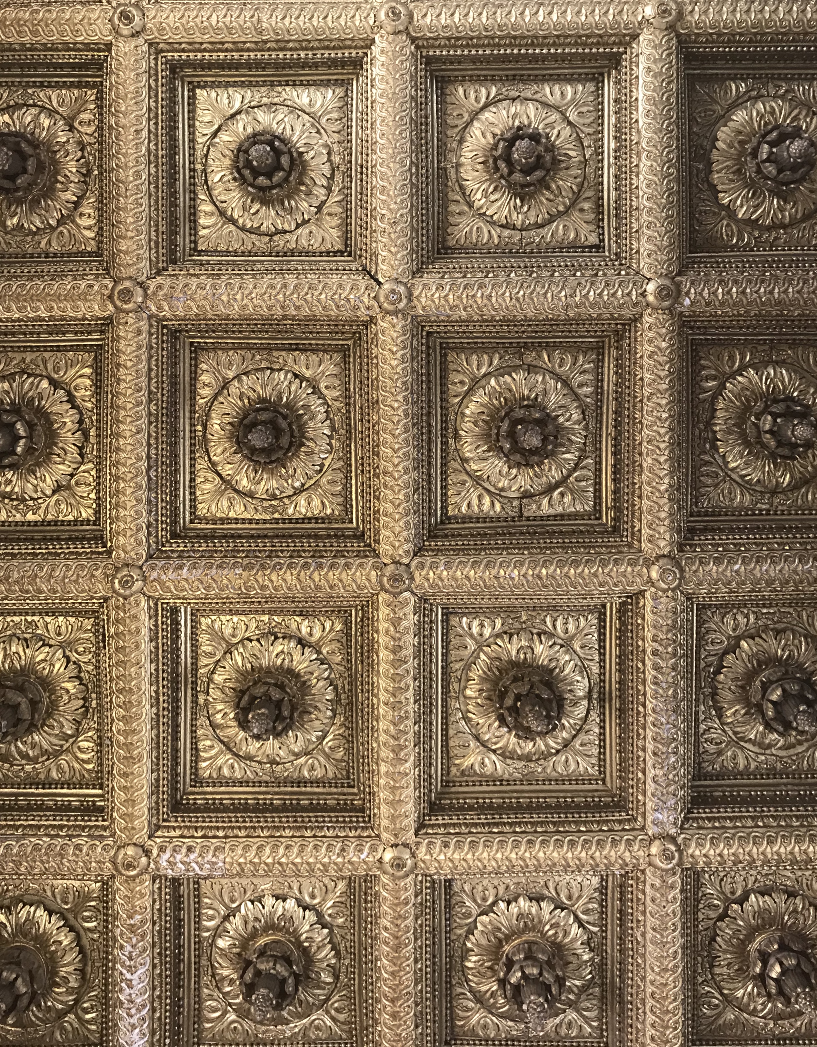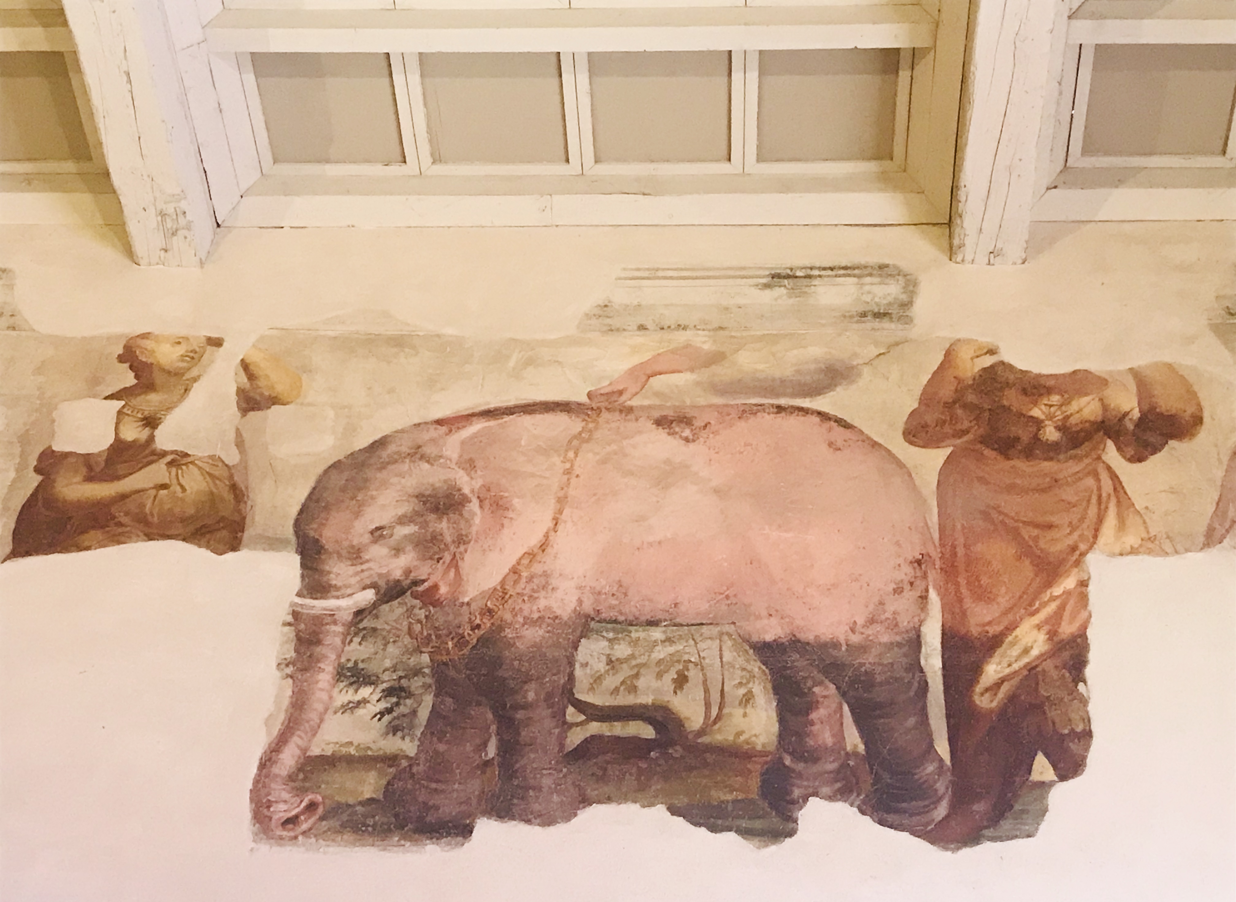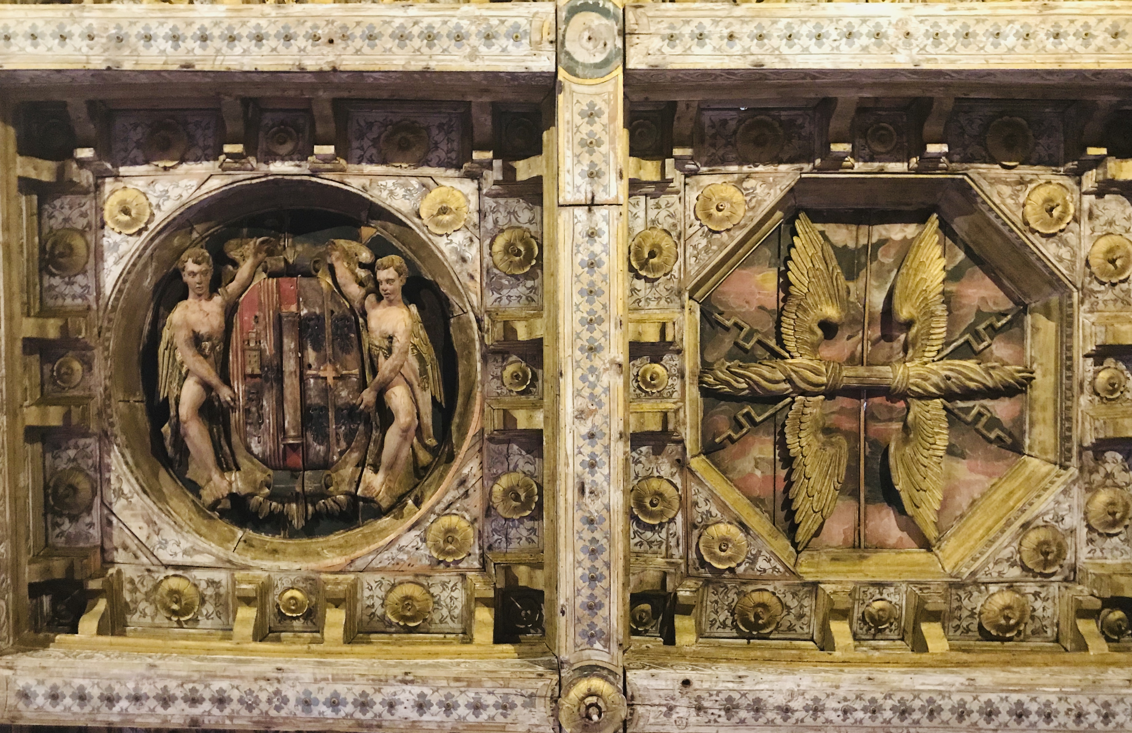 Esta sala comunica con varias habitaciones, una más bonita que la otra. Os señalo las cinco que más me gustaron (en sentido antihorario): la sala degli Imperatori, que tiene un techo esculpido maravilloso en el que se representa el rayo alado, símbolo del duque, y los escudos de las tres grandes familias Gonzaga, Colonna y Aragón; la galleria degli Antenati, la mejor conservada, donde hay 21 bajorrelieves en estuco con las efigies de los antepasados de Vespasiano y una bóveda preciosa dividida en diferentes frescos sobre los que destacan el de Apolo en el carro del sol, el de Mercurio y el de Marte; la sala degli Elefanti, antes usada para temas de justicia, que presenta un curioso friso con una serie de elefantes, cada uno de los cuales, lleva al cuello una cadena sujetada por un brazo para simbolizar que la razón humana pone freno a los instintos más potentes de la naturaleza y, de esta manera, hay orden y se garantiza la justicia; la saletta dell’Angelo, llamada así porque en el centro de su imponente y macizo techo de madera del Líbano aparece un ángel que aguanta el escudo ducal alrededor del cual hay, una vez más, el collar del Toisón; y, por último, la gran sala degli Ottagoni caracterizada por un techo que tiene un montón de piñas de madera apuntando al que se asoma por allí.