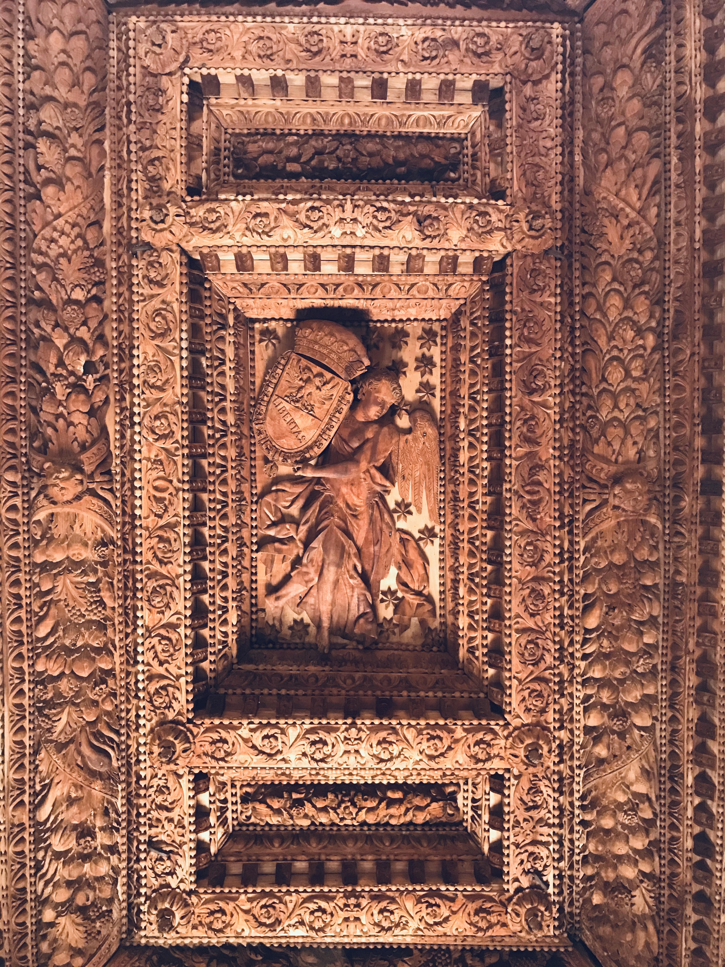 Tenéis que entrar porque vais a flipar. Impone sobremanera la logia semicircular con sus doce elegantes columnas corintias dominadas por doce estatuas de dioses del Olimpo, todos ellos representados con sus atributos. Si os sentáis en las gradas de madera, os van a parecer estatuas armoniosas pero, al igual que otros elementos presentes en la sala, es una ilusión óptica porque, en realidad, sus dimensiones están distorsionadas para que luzcan guais si se miran desde abajo.