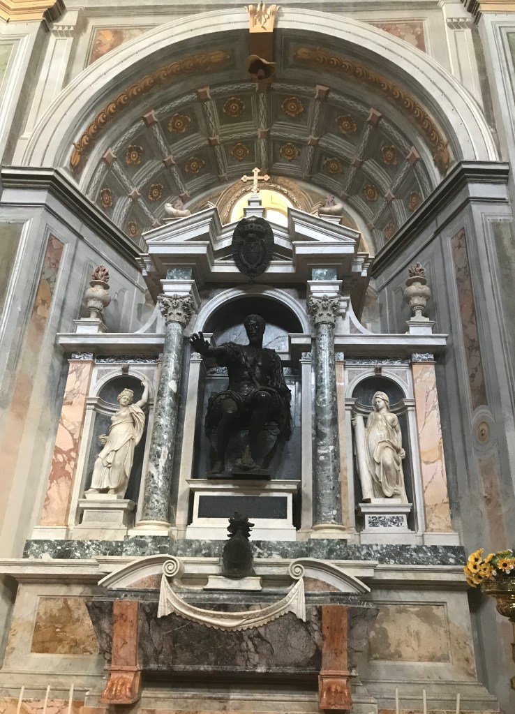 En el interior también se encuentra el mausoleo de Vespasiano. No os va a ser muy difícil localizarlo: en él hay mucho mármol polícromo y una estatua de bronce del susodicho que os resultará muy familiar puesto que hay otra muy similar en la primera sala del Palazzo Ducale que ya habréis visitado. Si prestáis atención, os daréis cuenta de que, en la representación, Vespasiano tiene mucho más de emperador romano (Marco Aurelio) que de duque. El tío creó una ciudad ideal como Roma, ¿no se podía permitir tal lujo? Y, ojo, que no está solo: para destacar sus virtudes de buen gobernante, le acompañan las representaciones alegóricas de la Fuerza del Espíritu y de la Justicia.