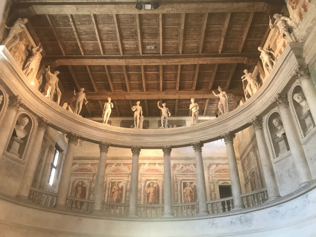 Tal y como vemos el teatro hoy en día es una maravilla pero, por lo que me contaron, en el siglo XVI tenía que ser algo supersónico. Se ve que en el techo había pintado un cielo estrellado del que colgaban unas bolitas de cristal llenas de líquidos de colores para que, cuando la luz las atravesara, proyectaran sombras psicodélicas más allá de las estrellas. De esta manera, se conseguía dar la sensación de un teatro al aire libre, como los teatros griegos en los que las representaciones se hacían de noche, a la luz de las estrellas. Lamentablemente, este techo, al igual que la escena fija original, no lo vemos por los usos poco ortodoxos que se hicieron del teatro a partir del siglo sucesivo: fue granero, almacén, cuartel y, hasta hace menos de 100 años, sala cinematográfica.