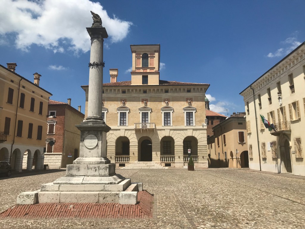 Este punto de información se encuentra en una de las esquinas de la piazza Ducale, el corazón de Sabbioneta. La plaza es rectangular y evidencia la rigidez en el plan urbano: en ella convergen ortogonalmente las calles principales con sus elegantes soportales y los edificios del poder. Vamos, todo un ejemplo de equilibrio y orden renacentistas.
