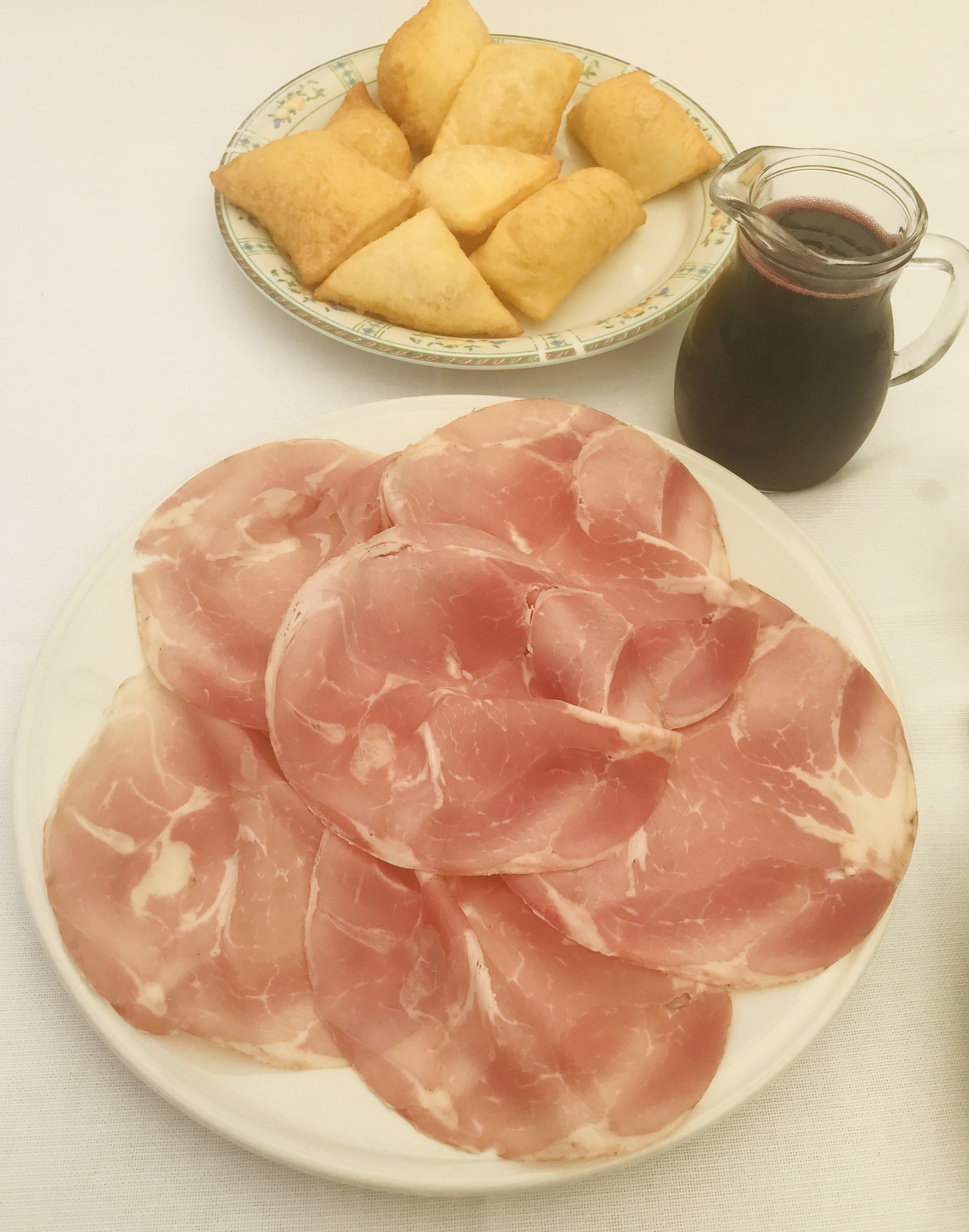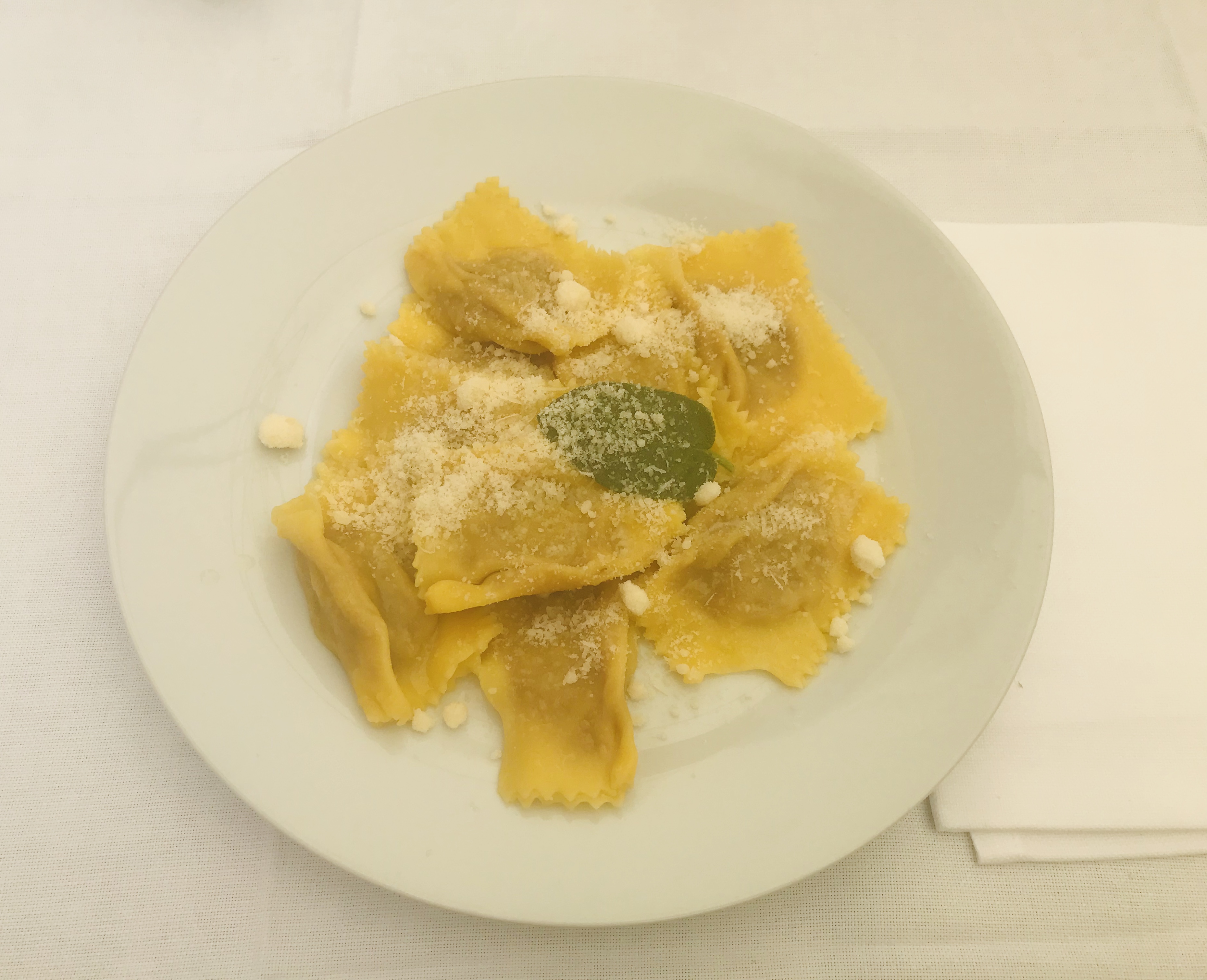 Cuando en Sabbioneta toca la una, para el visitante es hora de comer, básicamente, porque todas las atracciones turísticas están cerradas de una a dos y media. Para estar bien cerquita de lo que quería ver a primera hora de la tarde, me dirigí al ristorante Ducale, un local cuya especialidad es el gnocco fritto, un delicioso pan que, cuando se fríe, se infla como un globo. Me pedí esto con un poco de embutido como entrante y tortelli di zucca, una especie de raviolis rellenos de calabaza, muy típicos de la zona de Mantua. Cada uno de los platos me costó 9 euros, no está mal.