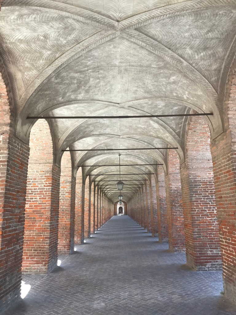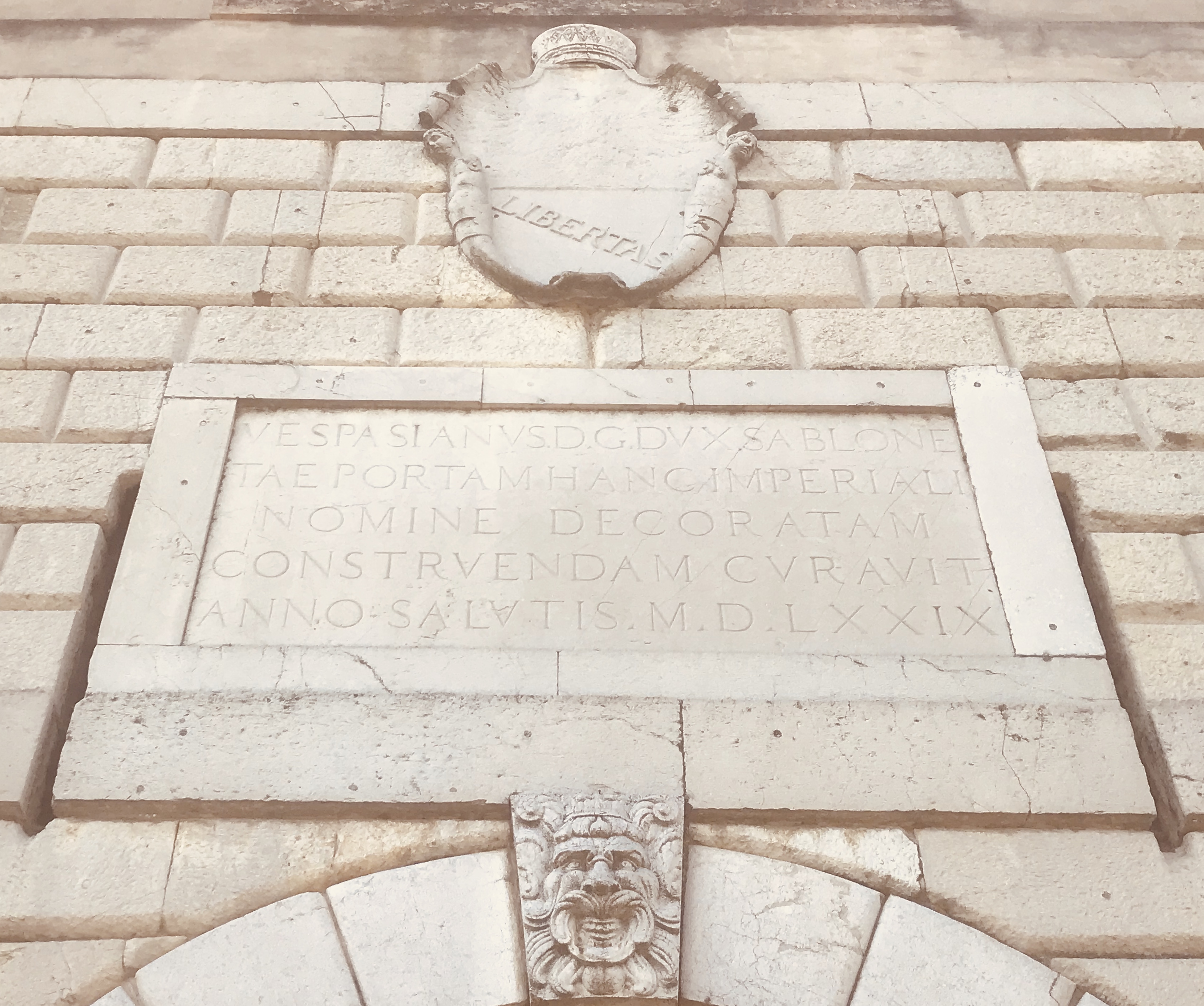 En un extremo está la Porta Vittoria, la primera puerta de Sabbioneta, que estaba orientada hacia la entonces Lombardía española. Si os fijáis en la entrada principal, veréis el escudo de los Gonzaga-Colonna y una inscripción en plan amuleto de la suerte que reza: «Vespasiano Gonzaga, marqués y fundador de Sabbioneta, dedicó esta puerta a la Victoria como buen agüero».