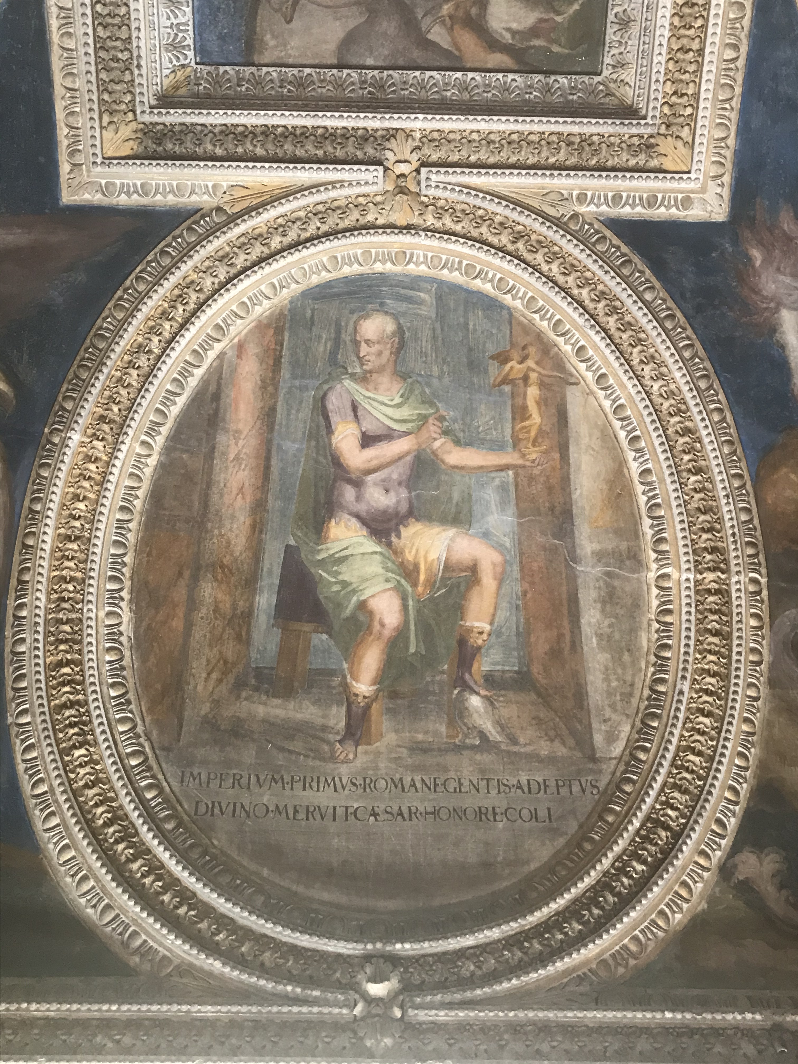 El edificio que preside uno de los lados de la plaza es el Palazzo Ducale, el primer edificio importante que Vespasiano construyó en la ciudad y que le sirvió como sede de representación y residencia privada. La fachada, con su soportal, sus grandes ventanales perfilados en mármol y sus bustos, es maravillosa y no es más que una pequeña muestra de la opulencia que se guardaba en su interior. Antes de entrar, os tenéis que fijar en un detalle para haceros una idea más clara del carácter del gran señor de Sabbioneta. En la fachada, se podría haber limitado a escribir en algún ladito que esa construcción era suya pero eso habría sido de medio pobres. ¿Qué hizo él? En los cinco arquitrabes escribió: VESP. D. G. DVX SABLON. I (Vespasiano, por gracia de Dios, primer duque de Sabbioneta). Hala, escrito cinco veces para que quede bien clarito. Vaya tío.
