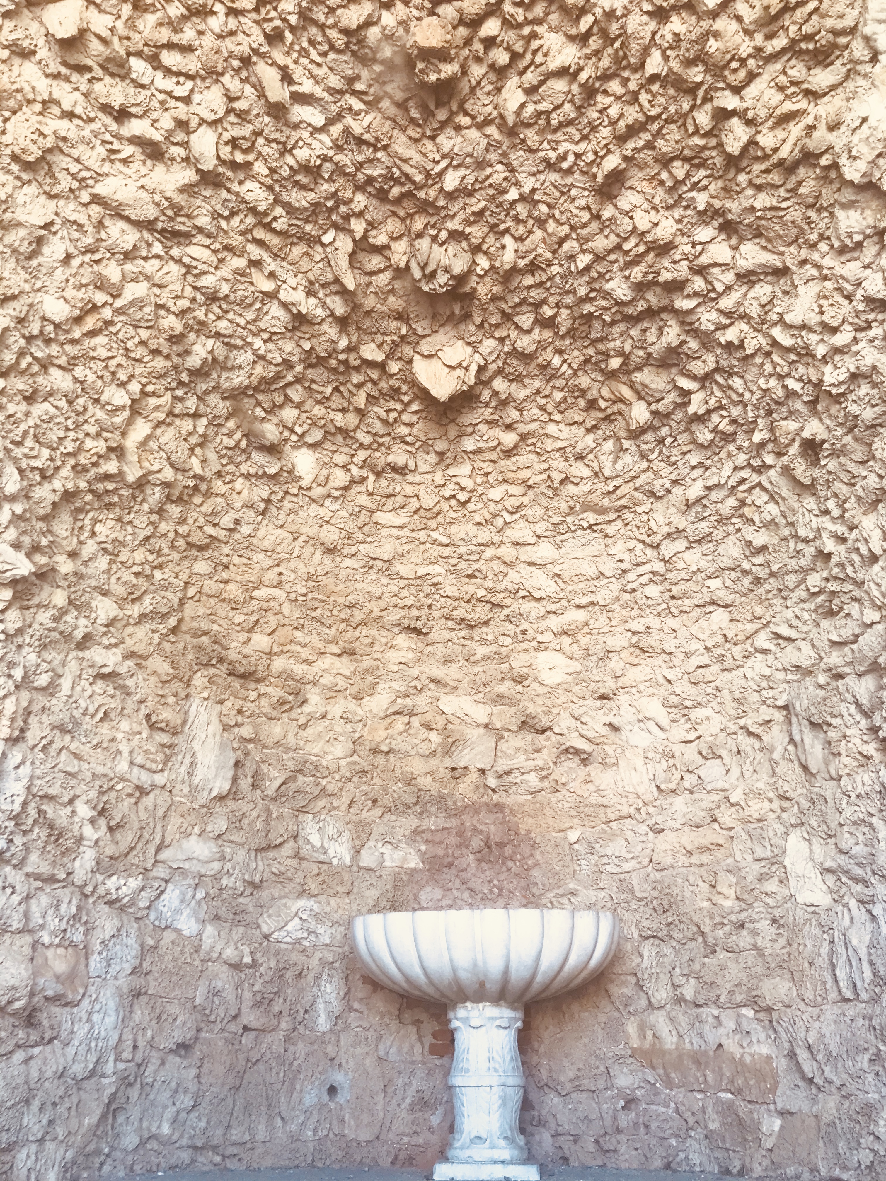 Desde la segunda sala de la planta baja, a mano izquierda, se accede a un jardín que conserva un tenue reflejo de su antiguo esplendor. Desde el único lado que no está amurallado, apreciaréis lo que se mantiene: un jardín perfectamente diseñado dominado por el orden y la geometría. Paseando por la calle principal, la de la fuente circular, ya tendréis que empezar a imaginar cómo era antes este remanso de paz. Os cuento un poco lo que sé, así os hacéis una idea más precisa: el problema de la solana Vespasiano lo tenía controlado porque las calles estaban cubiertas con pérgolas por las que trepaban plantas de vid y jazmines. A los lados, había algunas estatuas antiguas rodeadas de flores de diferentes tipos y jarrones con naranjas y limones, todo ello animado por juegos de agua. No está mal, ¿no? Por como me lo describieron, lo veo un lugar ideal para la vida contemplativa de la que probablemente gozó el duque en más de una ocasión.