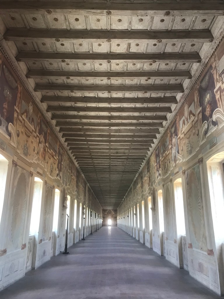 A diferencia de otras galerías, esta no servía para comunicar el Palazzo Giardini con ningún otro edificio emblemático, sino que tenía una función bien diferente: básicamente, Vespasiano la utilizaba en plan museo para chulear ante sus invitados de un popurrí de cosas valiosas: piezas arqueológicas, mármoles preciados del norte de África, armaduras de sus antepasados, estatuas romanas, animales exóticos disecados, etc. De todas maneras, de todo esto ya no queda nada porque en el siglo XVIII, como Sabbioneta estaba bajo el dominio austríaco, Maria Teresa de Austria se lo llevó para su casa, ¡incluso el suelo de mármol!