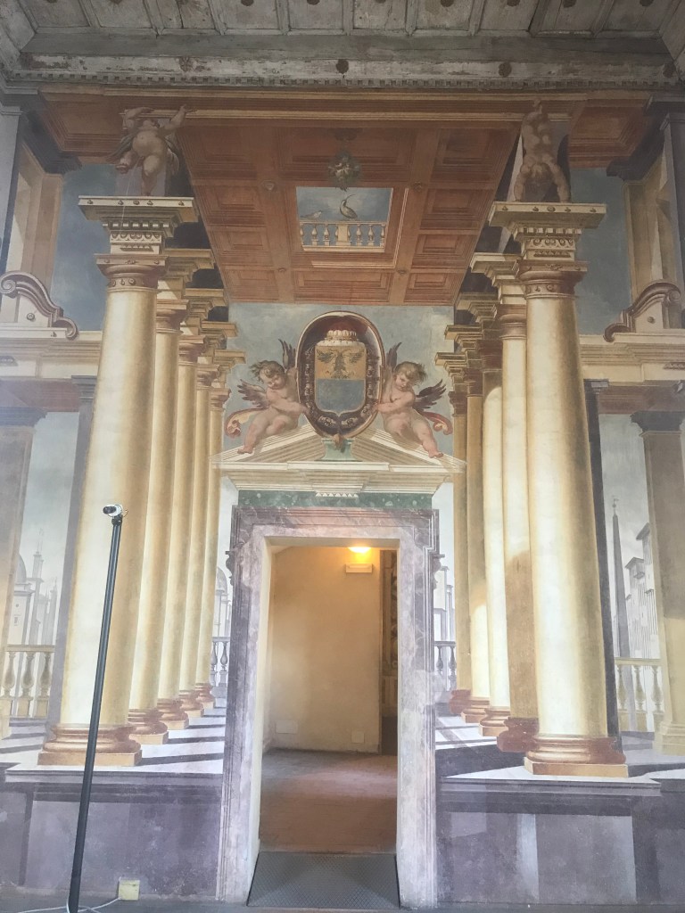 De todas maneras, los dos frescos que más llaman la atención por sus dimensiones son los de las vistas de Roma a través de dos arcos de triunfo. Ambos tenían la función de crear en los espectadores la ilusión de que se encontraban en un espacio al aire libre. A vuestra derecha, os quedará la piazza del Campidoglio encima de la cual podréis leer una inscripción que parafrasea la que aparece en la fachada principal del teatro: QUANTUM ROMA FUIT, IPSA RUINA DOCET (La grandeza de Roma la demuestran sus propias ruinas). A vuestra izquierda, en cambio, veréis Castel Sant’Angelo, menos lustroso por culpa de una puerta.
