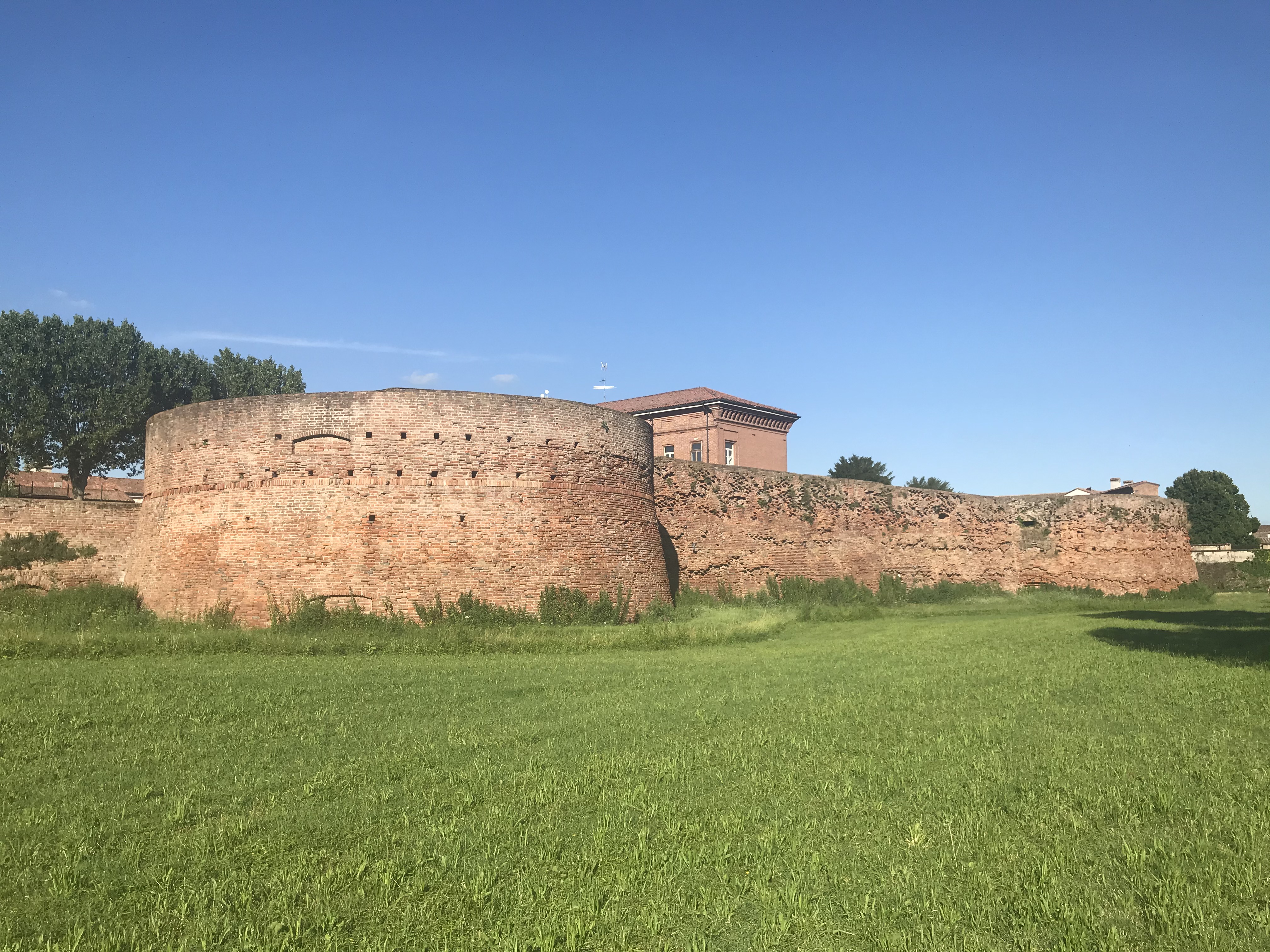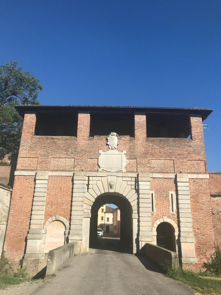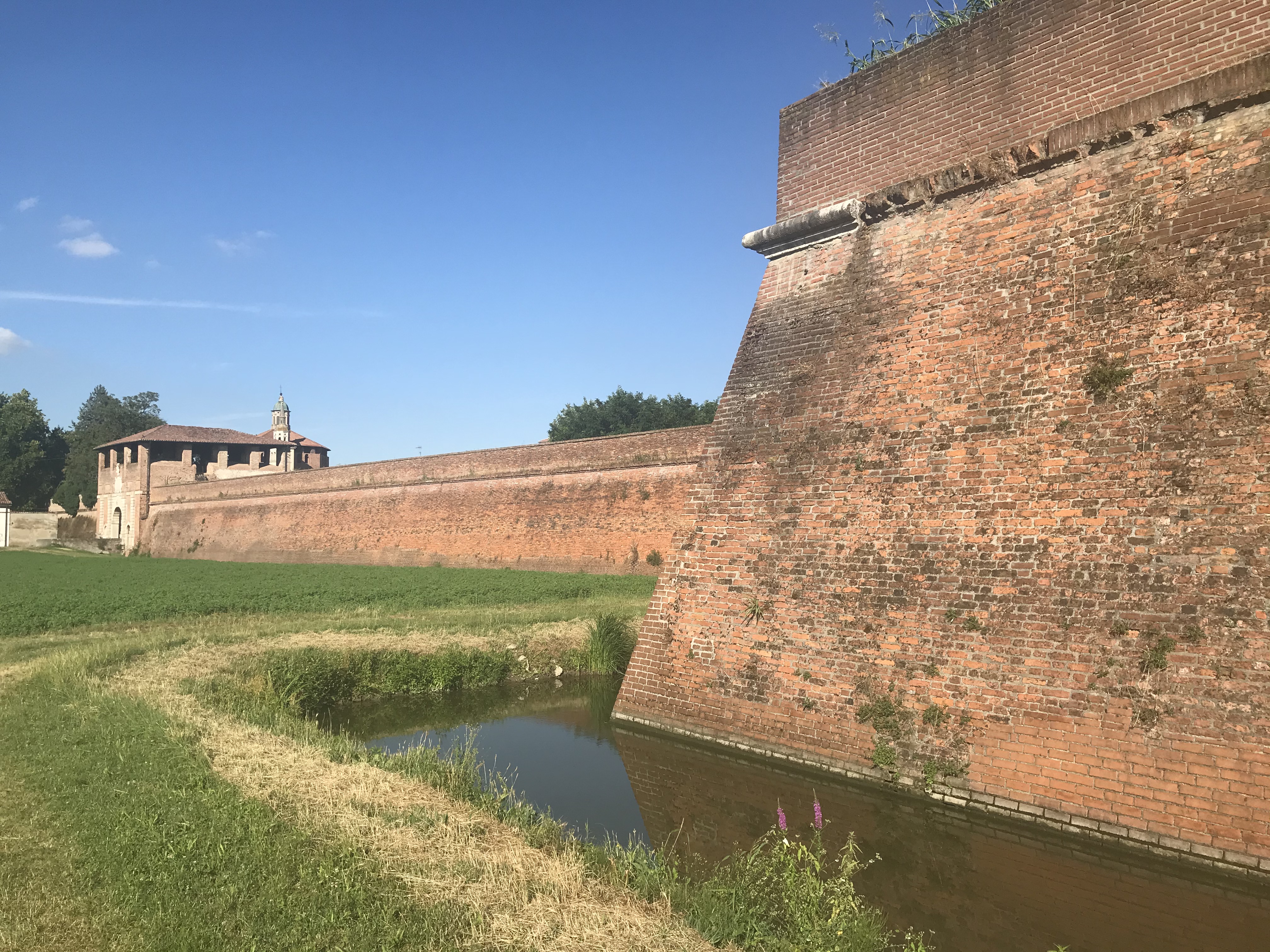 Sabbioneta está en medio de la nada pero tanta fastuosidad no podía estar dejado a la mano de Dios por lo que, como era de esperar, Vespasiano no se olvidó de protegerla con una muralla que casi se mantiene intacta. Tiene forma de hexágono irregular con seis bastiones y dos puertas de acceso diametralmente opuestas. Si tenéis ganas y tiempo, que sepáis que hay un pequeño recorrido que va de puerta a puerta y que permite ver los bastiones y la muralla desde fuera.