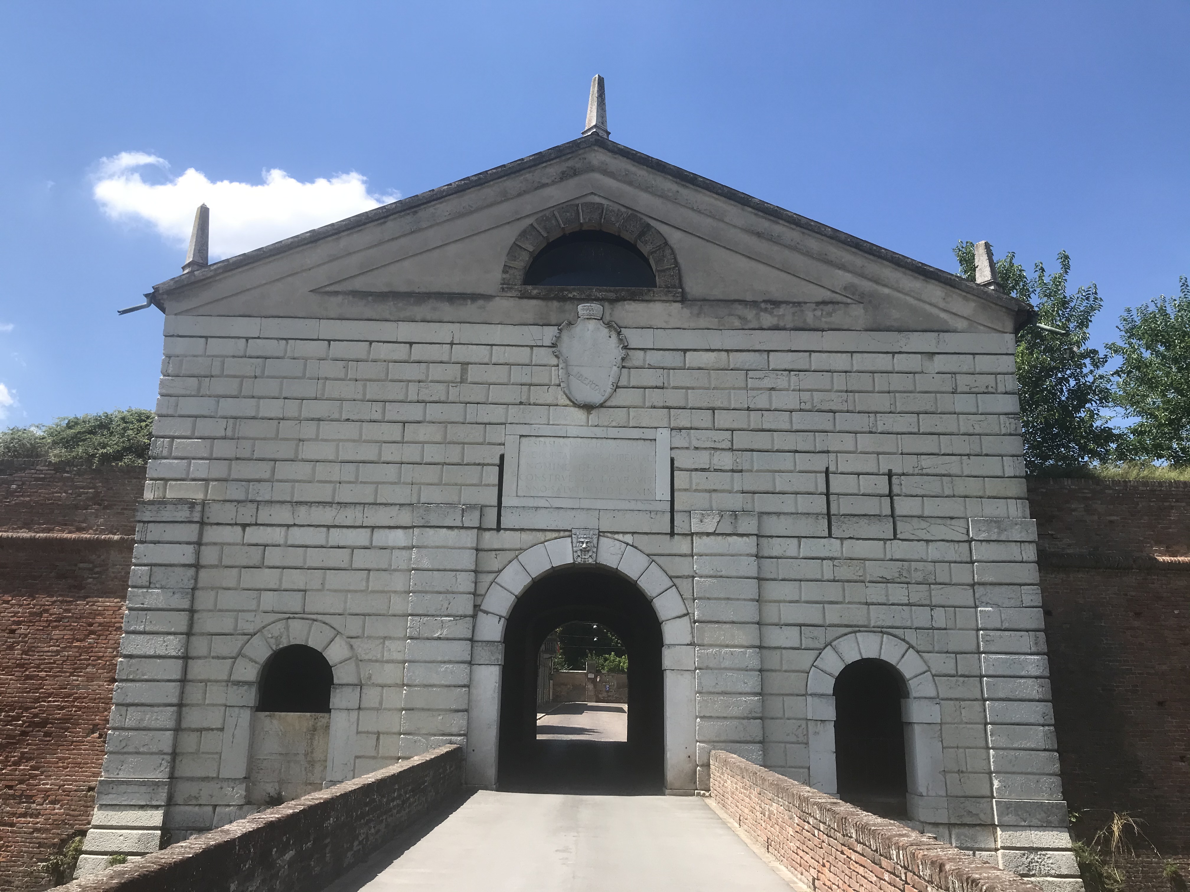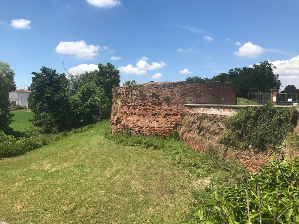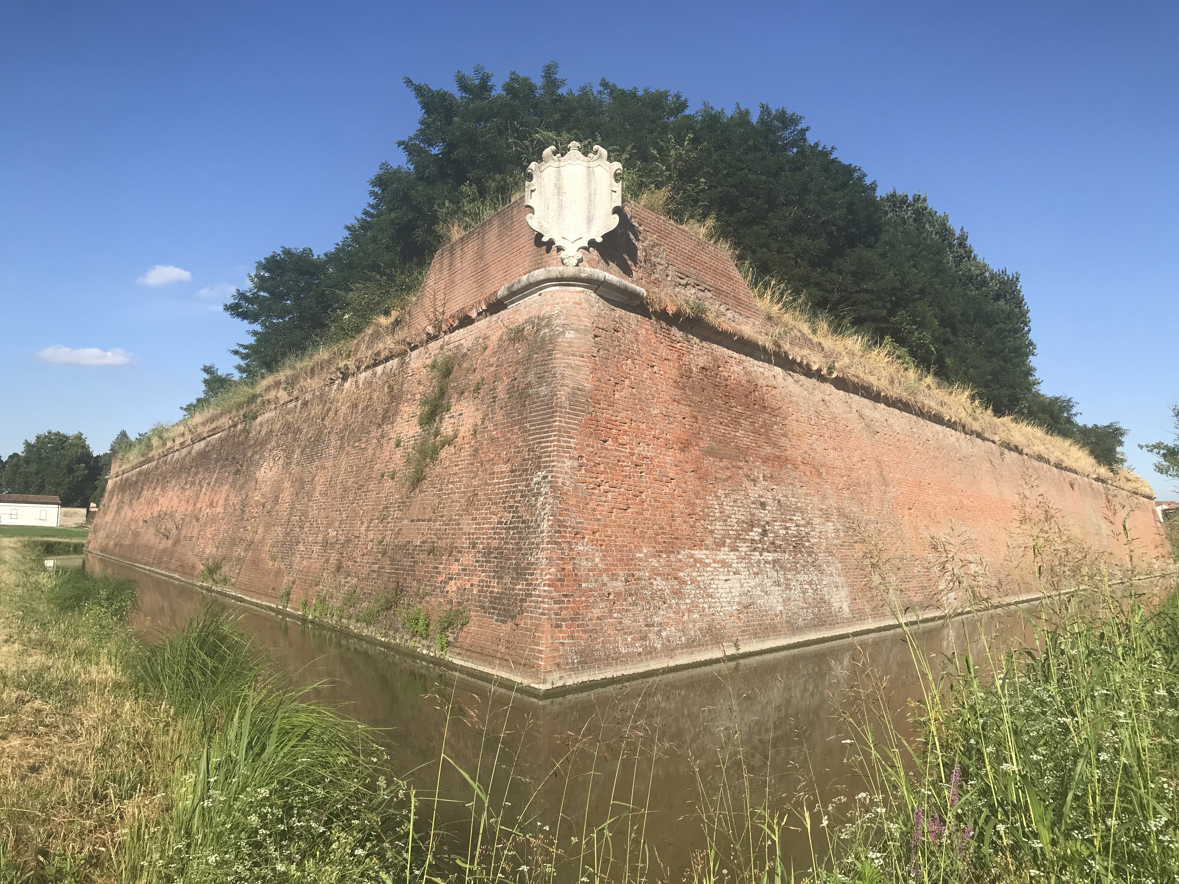 Sabbioneta está en medio de la nada pero tanta fastuosidad no podía estar dejado a la mano de Dios por lo que, como era de esperar, Vespasiano no se olvidó de protegerla con una muralla que casi se mantiene intacta. Tiene forma de hexágono irregular con seis bastiones y dos puertas de acceso diametralmente opuestas. Si tenéis ganas y tiempo, que sepáis que hay un pequeño recorrido que va de puerta a puerta y que permite ver los bastiones y la muralla desde fuera.