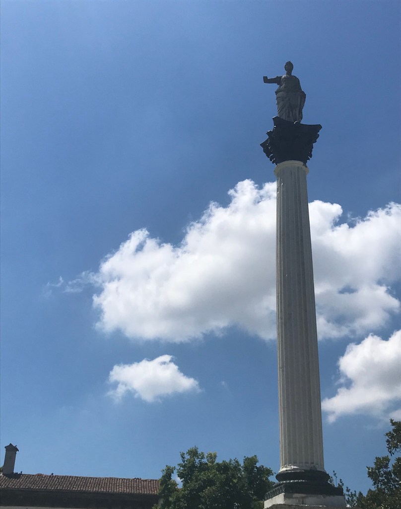 Asimismo, en el centro de la plaza, no os pasará inadvertida una columna jónica con un capitel corintio de bronce en cuya cima hay una preciosa estatua de Minerva, que no es una estatua cualquiera. Formaba parte de la colección arqueológica del duque, tenía la función de vigilar y proteger sus dominios y marcaba el epicentro ideal de la ciudad (antes estaba situada unos setenta metros más hacia atrás, más exactamente en el cruce de la via Vespasiano Gonzaga con via Dondi).