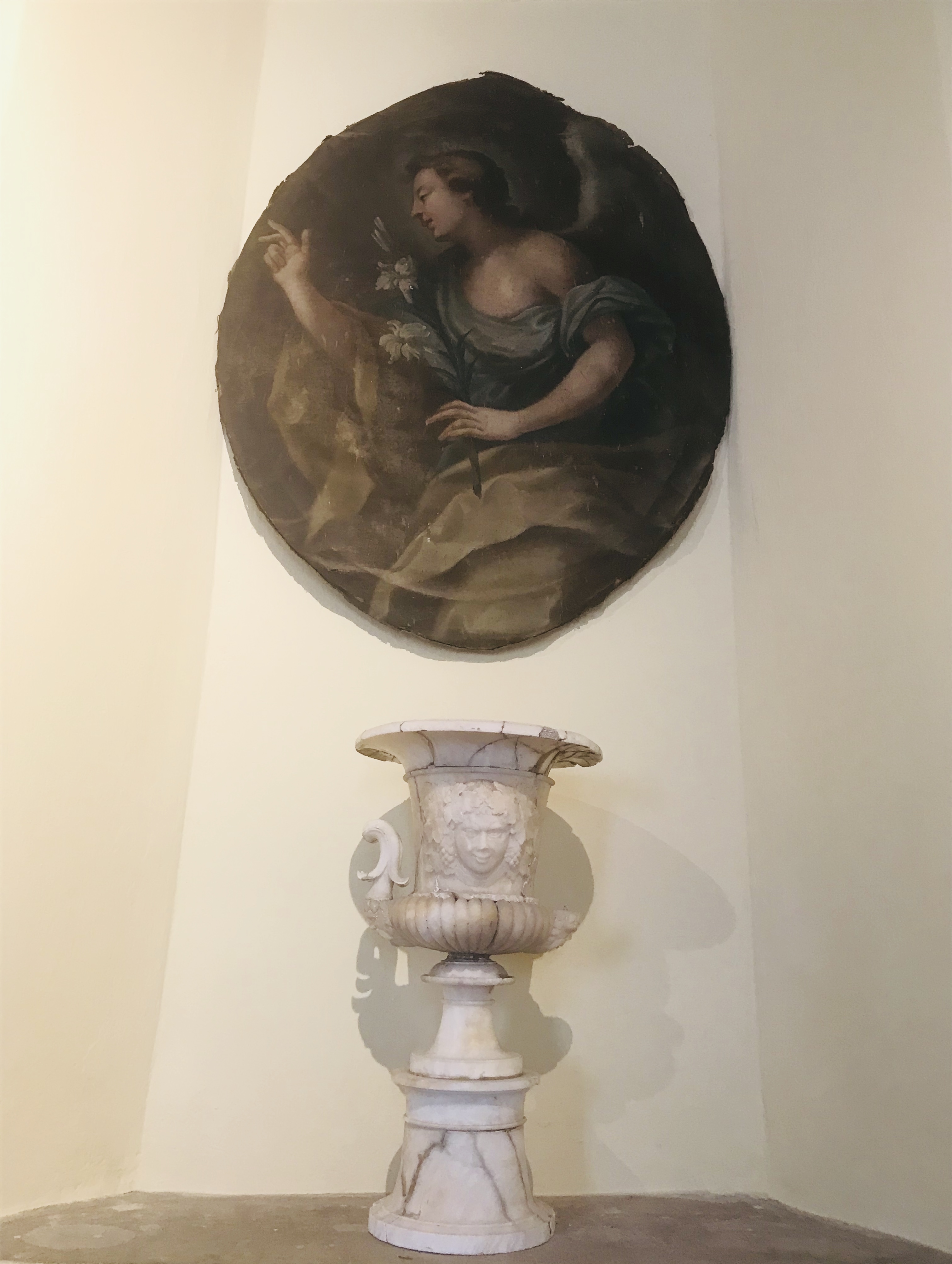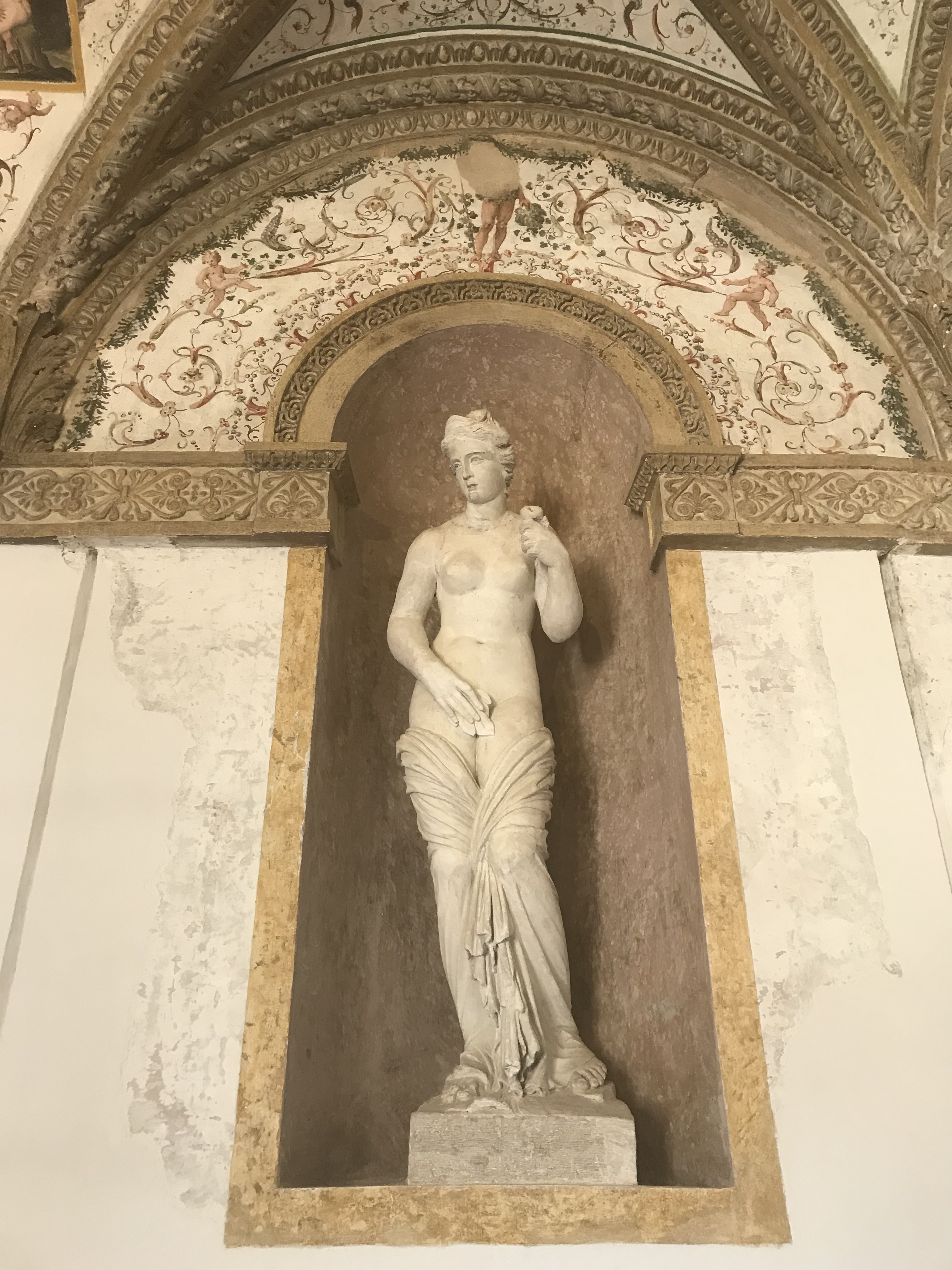 Aquí, como en el jardín, mientras os paseéis, tenéis que hacer un ejercicio de imaginación para trasladaros a su antiguo esplendor: a los grandes ventanales que hacen entrar mogollón de luz, les tenéis que sumar el suelo de mármol que antes comentábamos, de color amarillo, para que pareciera de oro. De esta manera, los rayos de luz que entraban, se proyectaban en el mármol y las cositas de la colección de Vespasiano brillaban a más no poder. Era todo un espectáculo de luz, de color y de arte.