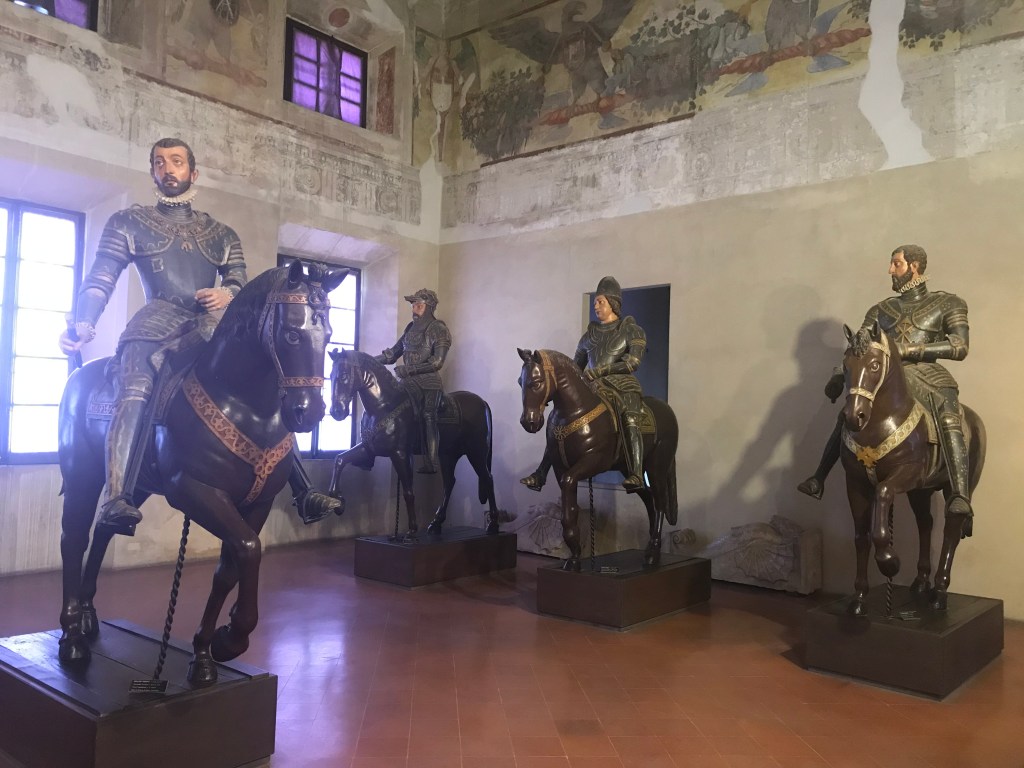 Cuando subáis a la planta de arriba, vais a ver que, a mano izquierda, en la sala delle Aquile, os estarán esperando cuatro de las diez piezas que conformaban la Cavalcata, una colección de estatuas ecuestres de madera, a tamaño natural, que representaban el poder y las virtudes militares de Vespasiano y de sus antepasados. A simple vista, la pieza del gran duque, que luce en el centro de la sala, os parecerá muy similar a las otras tres pero, como siempre, os tendréis que fijar en los detalles. Vespasiano lleva un collar de la Orden del Toisón de Oro (no sé si la conoceréis pero es una de las órdenes de caballería más top y antiguas de Europa) y la crin de su caballo está más elaborada que la del resto. Otro dato curioso: no todos los caballos tienen levantada la misma pata ¿Por qué? Los que tienen levantada la pata derecha indican que su jinete murió por causas naturales mientras que los que se presentan con la pata izquierda levantada, señalan que su jinete fue un gran comandante y murió luchando.