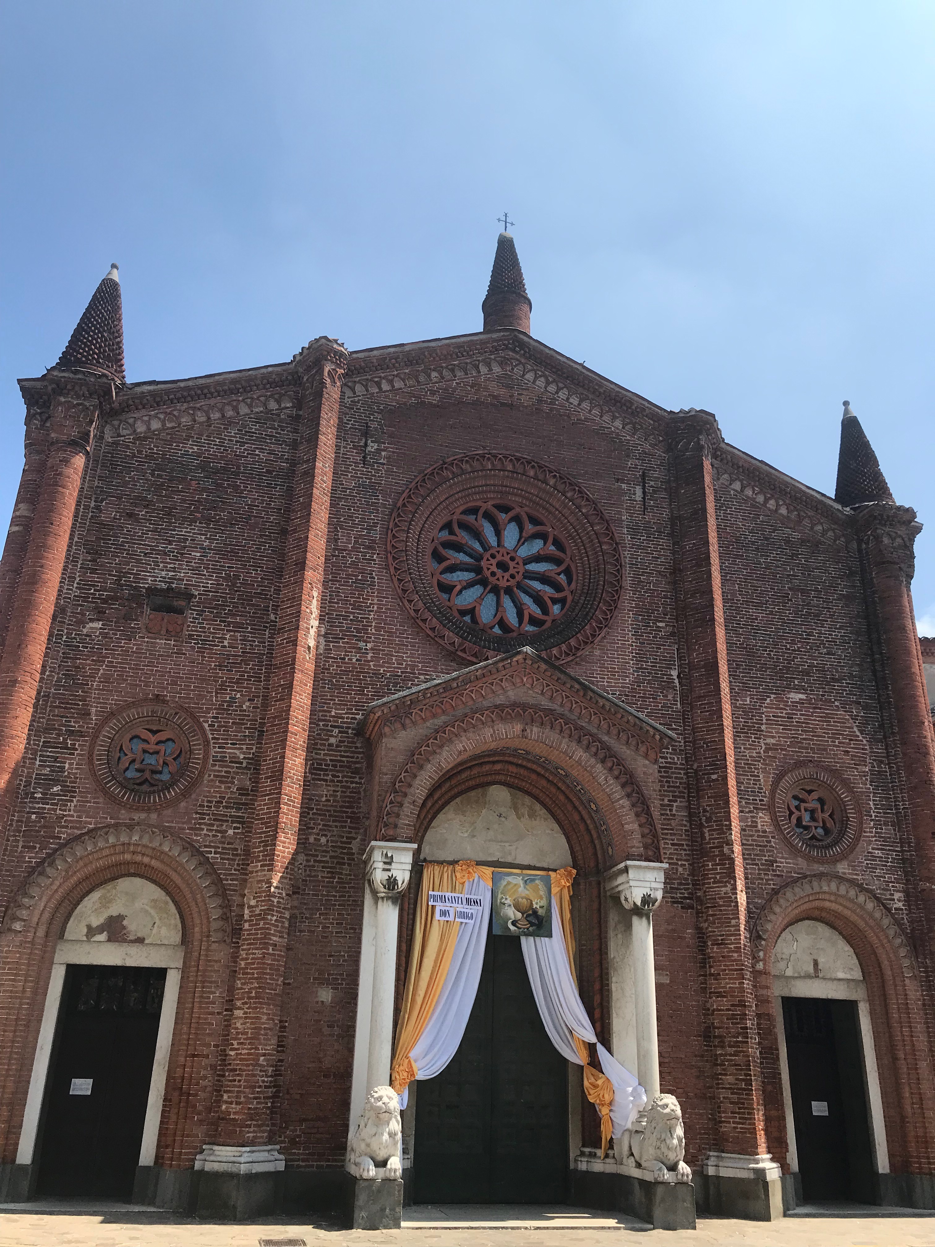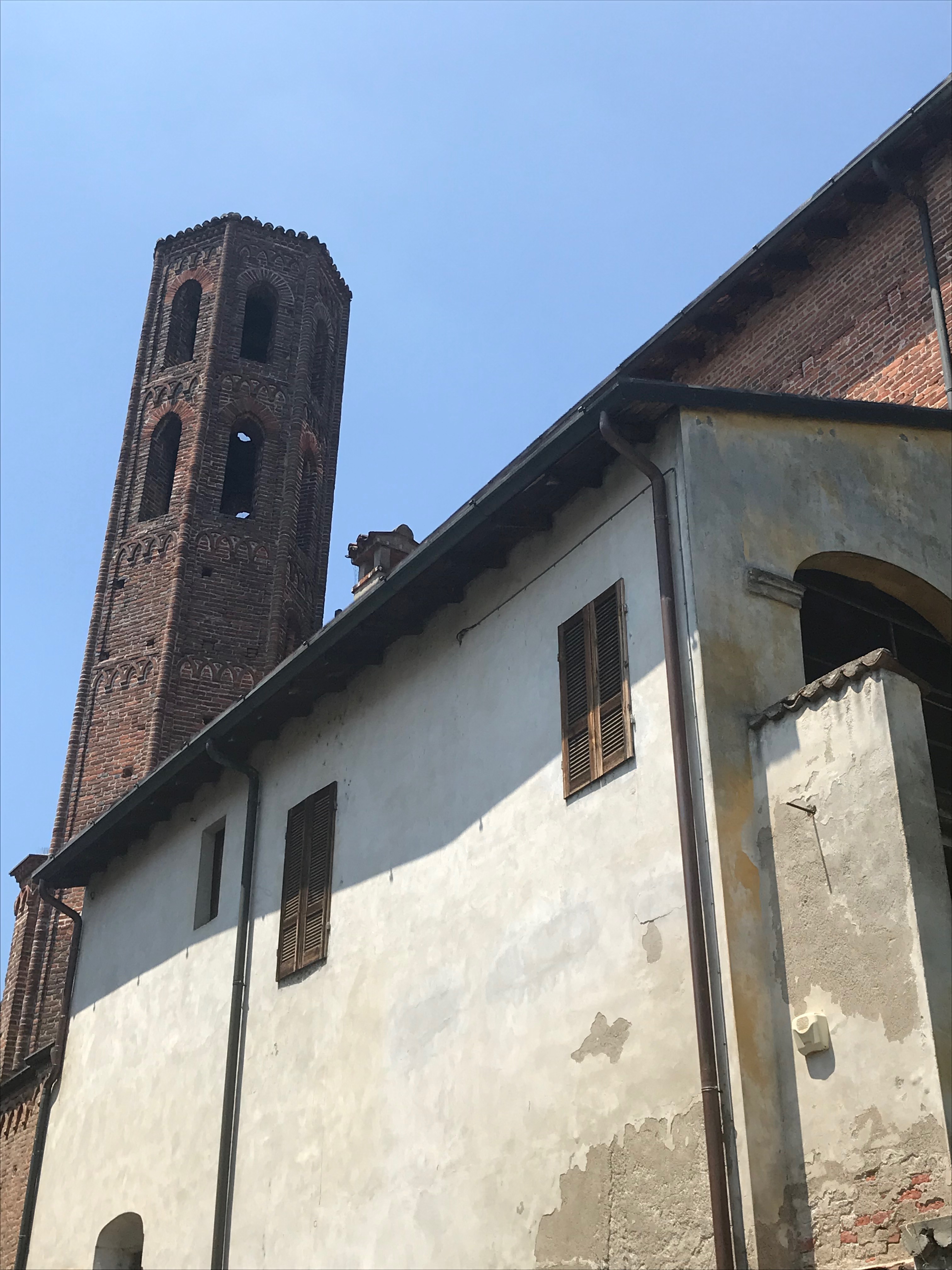 Se construyó a finales del siglo XIII y sigue el típico esquema arquitectónico de los edificios lombardos de la época: está hecho en ladrillo rojo, tiene un amplio pórtico y su fachada está caracterizada por ventanas ojivales y almenas.