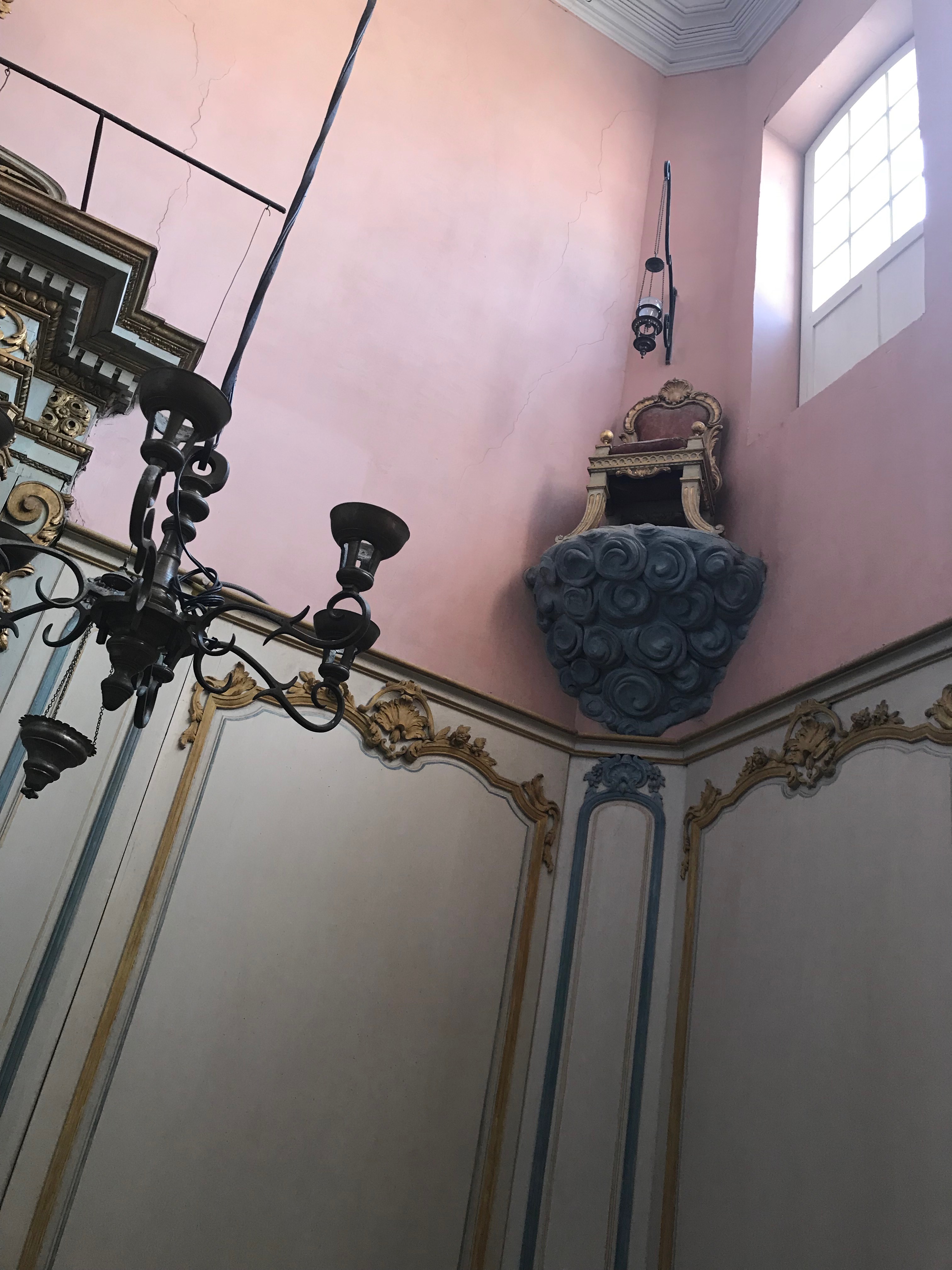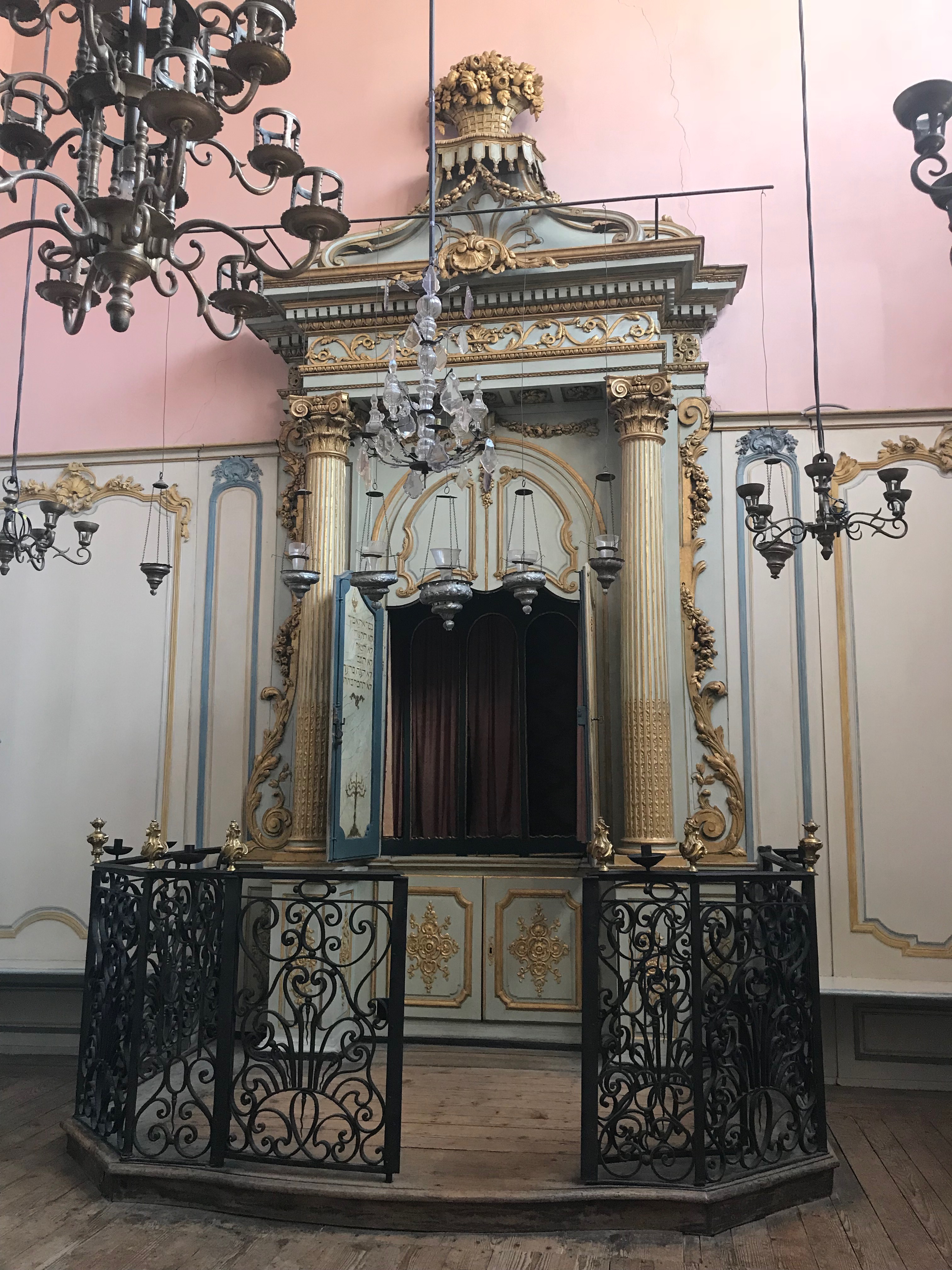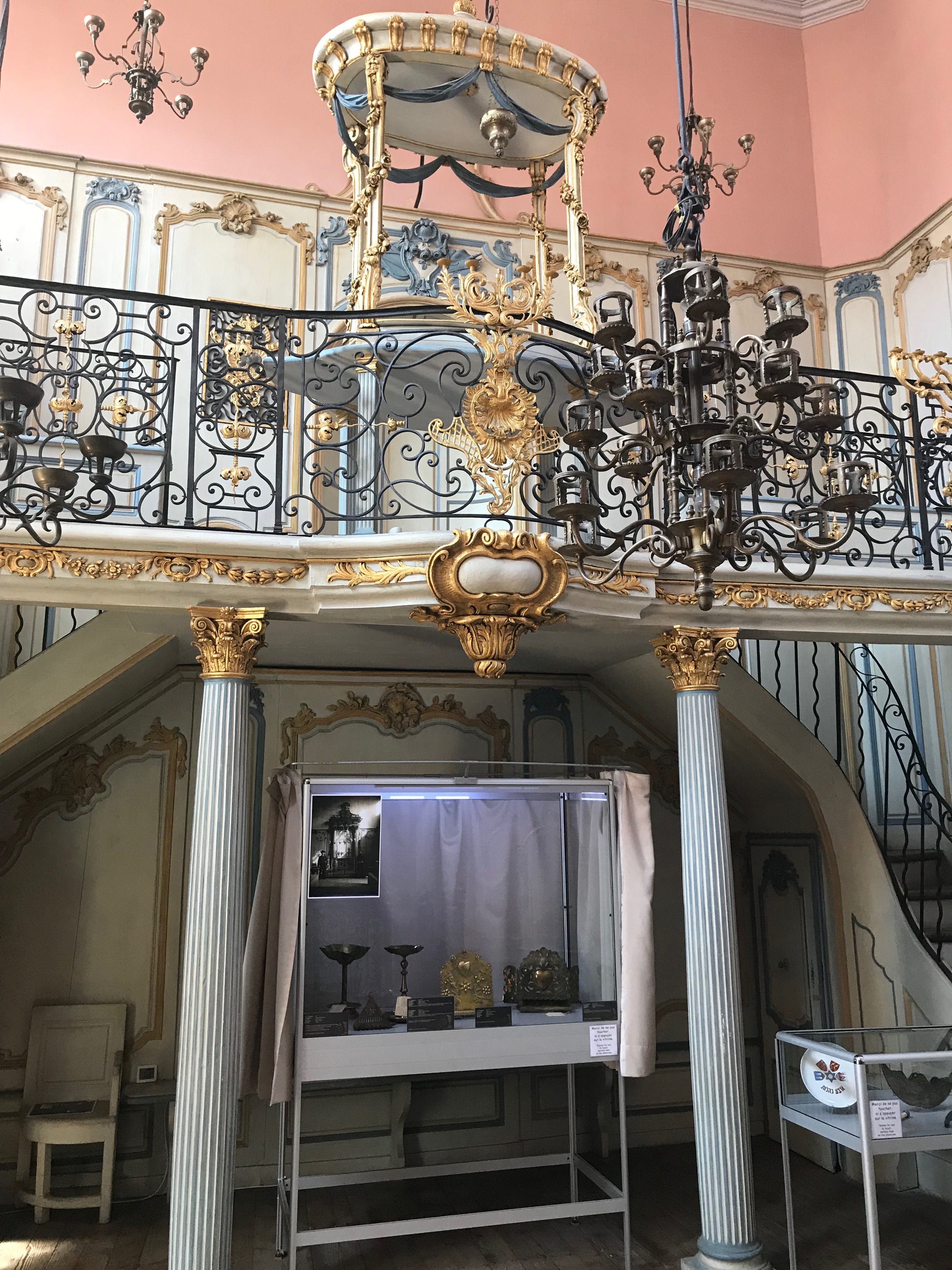 Como cualquier otra sinagoga, se encuentra en la parte superior del edificio para que, por encima de ella, no haya otra cosa que el cielo infinito y, en su interior, podréis ver el mobiliario original. Me parecieron especialmente bonitos la reja de hierro forjado y los estucos del techo que descansan sobre cuatro columnas corintias, clara alusión al templo de Salomón.